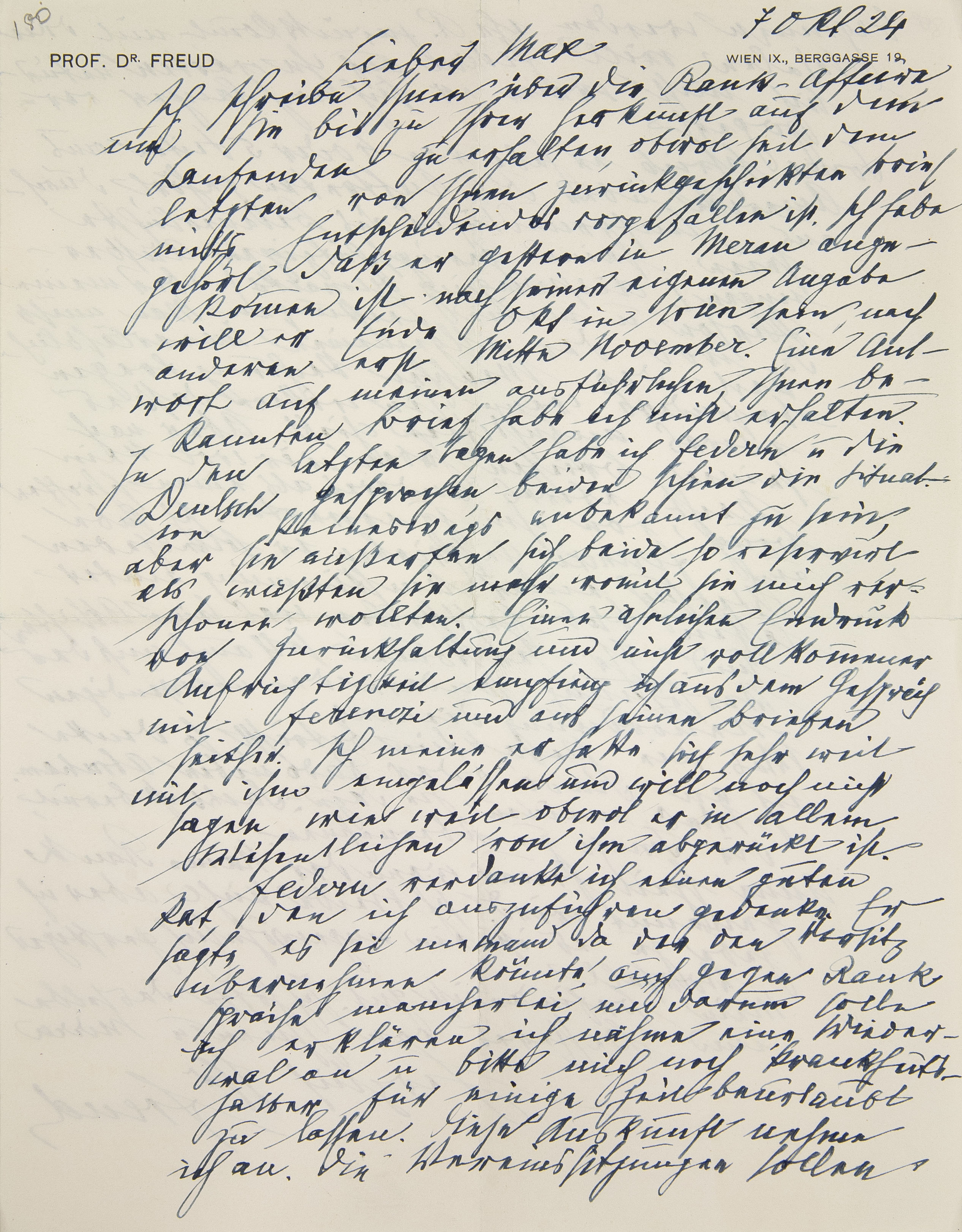Ich schreibe Ihnen über die Rank-Affaire, um Sie bis zu Ihrer Herkunft auf dem laufenden zu erhalten, obwohl seit dem letzten von Ihnen zurückgeschickten Brief nichts Entscheidendes vorgefallen ist. Ich habe gehört, daß er gestern in Meran angekommen ist; nach seiner eigenen Angabe will er Ende Oktober in Wien sein, nach anderen erst Mitte November. Eine Antwort auf meinen ausführlichen, Ihnen bekannten Brief habe ich nicht erhalten.