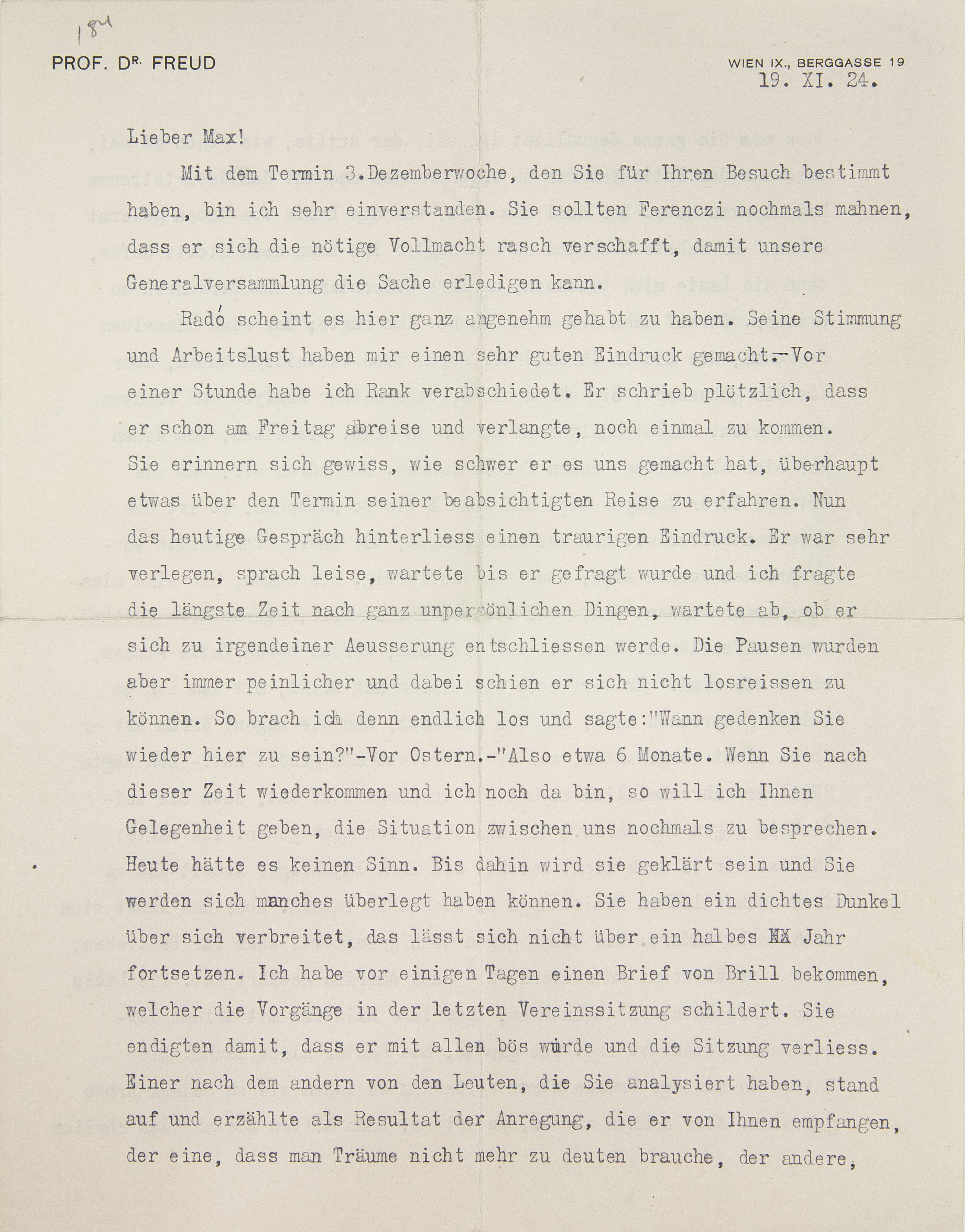 Mit dem Termin dritte Dezemberwoche, den Sie für Ihren Besuch bestimmt haben, bin ich sehr einverstanden. Sie sollten Ferenczi nochmals mahnen, daß er sich die nötige Vollmacht1 rasch verschafft, damit unsere Generalversammlung die Sache erledigen kann.