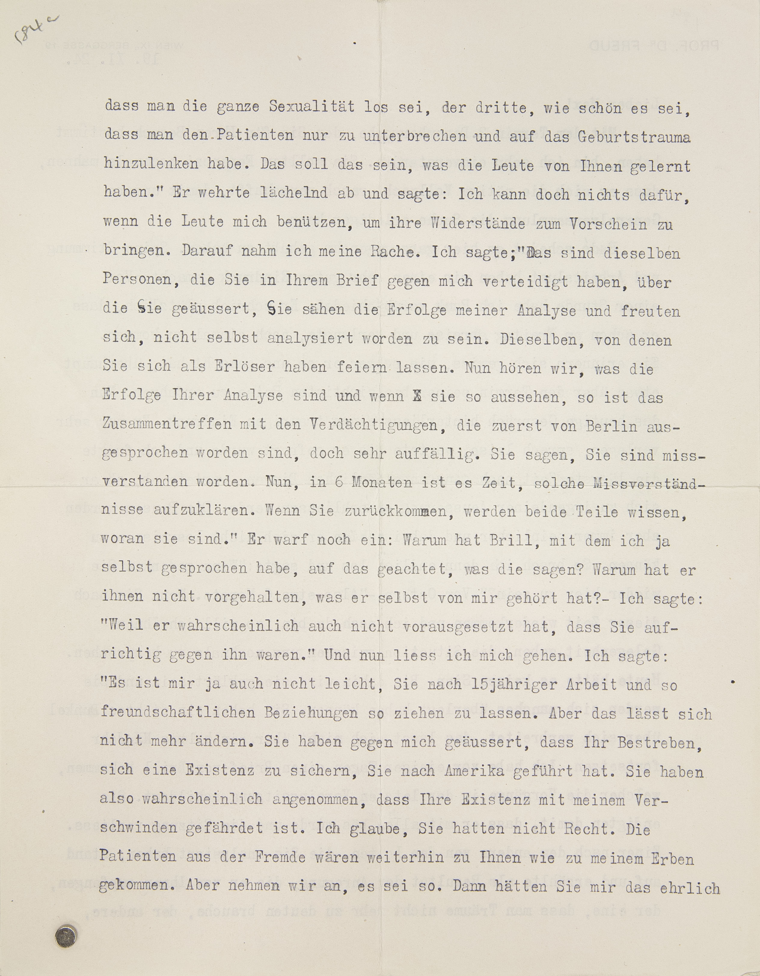 Als Antwort auf den Brief von Brill, den ich Ferenczi geschickt habe und der sehr bald in Ihren Händen sein wird, habe ich Brill eine wahrheitsgetreue Darstellung der Vorgänge hier und unsrer jetzigen Stellung zu Rank geschickt.7 Ich habe die strenge Weisung hinzugefügt, sich dieses Briefes nicht in indiskreter Weise zu bedienen, sondern abzuwarten, was Rank tut, und den Kampf gegen ihn, wenn notwendig, im eigenen Namen zu führen. Ich will natürlich nicht, daß Rank später erzählt, meine Rachsucht habe ihn nach Amerika verfolgt und seine Niederlassung verhindert. Es wird zwar nichts nützen; wenn er Mißerfolg hat, wird er doch wieder mich beschuldigen.
