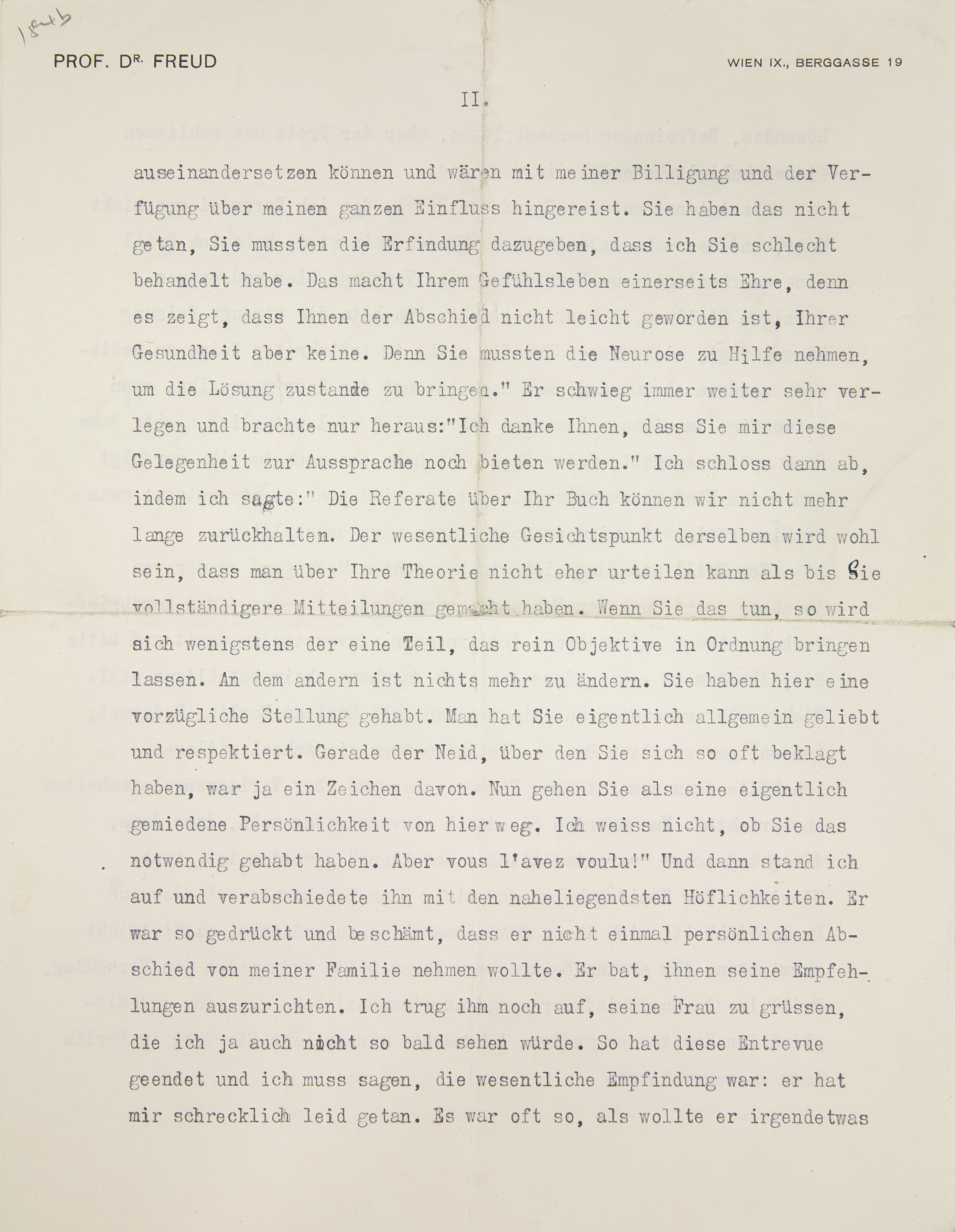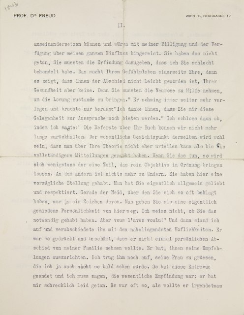 Vor einer Stunde habe ich Rank verabschiedet. Er schrieb plötzlich, daß er schon am Freitag2 abreise, und verlangte, noch einmal zu kommen. Sie erinnern sich gewiß, wie schwer er es uns gemacht hat, überhaupt etwas über den Termin seiner beabsichtigten Reise zu erfahren. Nun, das heutige Gespräch hinterließ einen traurigen Eindruck. Er war sehr verlegen, sprach leise, wartete, bis er gefragt wurde, und ich fragte die längste Zeit nach ganz unpersönlichen Dingen, wartete ab, ob er sich zu irgendeiner Äußerung entschließen werde. Die Pausen wurden aber immer peinlicher, und dabei schien er sich nicht losreißen zu können. So brach ich denn endlich los und sagte: „Wann gedenken Sie wieder hier zu sein?“ – Vor Ostern. – „Also etwa sechs Monate. Wenn Sie nach dieser Zeit wiederkommen und ich noch da bin, so will ich Ihnen Gelegenheit geben, die Situation zwischen uns nochmals zu besprechen. Heute hätte es keinen Sinn. Bis dahin wird sie geklärt sein, und Sie werden sich manches überlegt haben können. Sie haben ein dichtes Dunkel über sich verbreitet, das läßt sich nicht über ein halbes Jahr fortsetzen. Ich habe vor einigen Tagen einen Brief von Brill bekommen, welcher die Vorgänge in der letzten Vereinssitzung schildert.3 Sie endigten damit, daß er mit allen bös wurde und die Sitzung verließ. Einer nach dem andern von den Leuten, die Sie analysiert haben, stand auf und erzählte als Resultat der Anregung, die er von Ihnen empfangen, der eine, daß man Träume nicht mehr zu deuten brauche, der andere, daß man die ganze Sexualität los sei, der dritte, wie schön es sei, daß man den Patienten nur zu unterbrechen und auf das Geburtstrauma hinzulenken habe. Das soll das sein, was die Leute von Ihnen gelernt haben.“ Er wehrte lächelnd ab und sagte: Ich kann doch nichts dafür, wenn die Leute mich benützen, um ihre Widerstände zum Vorschein zu bringen. Darauf nahm ich meine Rache. Ich sagte: „Das sind dieselben Personen, die Sie in Ihrem Brief gegen mich verteidigt haben, über die Sie geäußert, Sie sähen die Erfolge meiner Analyse und freuten sich, nicht selbst analysiert worden zu sein. Dieselben, von denen Sie sich als Erlöser haben feiern lassen.4 Nun hören wir, was die Erfolge Ihrer Analyse sind, und wenn sie so aussehen, so ist das Zusammentreffen mit den Verdächtigungen, die zuerst von Berlin ausgesprochen worden sind, doch sehr auffällig. Sie sagen, Sie sind mißverstanden worden. Nun, in sechs Monaten ist es Zeit, solche Mißverständnisse aufzuklären. Wenn Sie zurückkommen, werden beide Teile wissen, woran sie sind.“ Er warf noch ein: Warum hat Brill, mit dem ich ja selbst gesprochen habe, auf das geachtet, was die sagen? Warum hat er ihnen nicht vorgehalten, was er selbst von mir gehört hat? – Ich sagte: „Weil er wahrscheinlich auch nicht vorausgesetzt hat, daß Sie aufrichtig gegen ihn waren.“ Und nun ließ ich mich gehen. Ich sagte: „Es ist mir ja auch nicht leicht, Sie nach 15jähriger Arbeit und so freundschaftlichen Beziehungen so ziehen zu lassen. Aber das läßt sich nicht mehr ändern. Sie haben gegen mich geäußert, daß Ihr Bestreben, sich eine Existenz zu sichern, Sie nach Amerika geführt hat. Sie haben also wahrscheinlich angenommen, daß Ihre Existenz mit meinem Verschwinden gefährdet ist. Ich glaube, Sie hatten nicht recht. Die Patienten aus der Fremde wären weiterhin zu Ihnen wie zu meinem Erben gekommen. Aber nehmen wir an, es sei so. Dann hätten Sie mir das ehrlich auseinandersetzen können und wären mit meiner Billigung und der Verfügung über meinen ganzen Einfluß hingereist. Sie haben das nicht getan, Sie mußten die Erfindung dazugeben, daß ich Sie schlecht behandelt habe. Das macht Ihrem Gefühlsleben einerseits Ehre, denn es zeigt, daß Ihnen der Abschied nicht leicht geworden ist, Ihrer Gesundheit aber keine. Denn Sie mußten die Neurose zu Hilfe nehmen, um die Lösung zustande zu bringen.“ Er schwieg immer weiter sehr verlegen und brachte nur heraus: „Ich danke Ihnen, daß Sie mir diese Gelegenheit zur Aussprache noch bieten werden.“ Ich schloß dann ab, indem ich sagte: „Die Referate über Ihr Buch können wir nicht mehr lange zurückhalten.5 Der wesentliche Gesichtspunkt derselben wird wohl sein, daß man über Ihre Theorie nicht eher urteilen kann, als bis Sie vollständigere Mitteilungen gemacht haben. Wenn Sie das tun, so wird sich wenigstens der eine Teil, das rein Objektive, in Ordnung bringen lassen. An dem andern ist nichts mehr zu ändern. Sie haben hier eine vorzügliche Stellung gehabt. Man hat Sie eigentlich allgemein geliebt und respektiert. Gerade der Neid, über den Sie sich so oft beklagt haben, war ja ein Zeichen davon. Nun gehen Sie als eine eigentlich gemiedene Persönlichkeit von hier weg. Ich weiß nicht, ob Sie das notwendig gehabt haben. Aber vous l’avez voulu!6“ Und dann stand ich auf und verabschiedete ihn mit den naheliegendsten Höflichkeiten. Er war so gedrückt und beschämt, daß er nicht einmal persönlichen Abschied von meiner Familie nehmen wollte. Er bat, ihnen seine Empfehlungen auszurichten. Ich trug ihm noch auf, seine Frau zu grüßen, die ich ja auch nicht so bald sehen würde. So hat diese Entrevue geendet, und ich muß sagen, die wesentliche Empfindung war: er hat mir schrecklich leid getan. Es war oft so, als wollte er irgend etwas Lösendes, Befreiendes herausbringen, aber der Trotz des schlimmen Kindes behielt jedesmal die Oberhand.