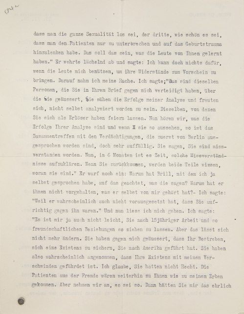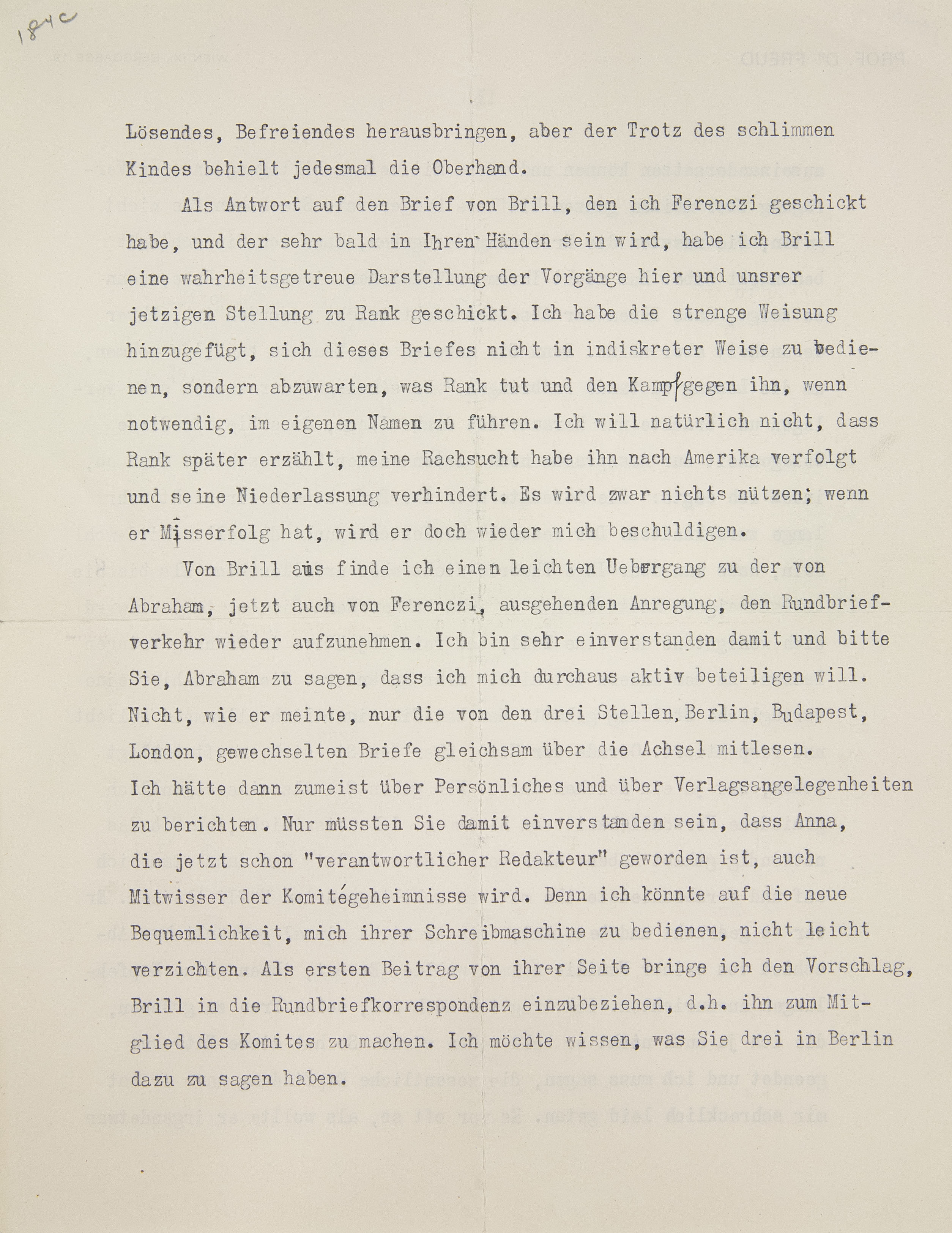 Von Brill aus finde ich einen leichten Übergang zu der von Abraham, jetzt auch von Ferenczi, ausgehenden Anregung, den Rundbriefverkehr wieder aufzunehmen.8 Ich bin sehr einverstanden damit und bitte Sie, Abraham zu sagen, daß ich mich durchaus aktiv beteiligen will. Nicht, wie er meinte, nur die von den drei Stellen, Berlin, Budapest, London, gewechselten Briefe gleichsam über die Achsel mitlesen. Ich hätte dann zumeist über Persönliches und über Verlagsangelegenheiten zu berichten. Nur müßten Sie damit einverstanden sein, daß Anna, die jetzt schon „verantwortlicher Redakteur“ geworden ist, auch Mitwisser der Komiteegeheimnisse wird.9 Denn ich könnte auf die neue Bequemlichkeit, mich ihrer Schreibmaschine zu bedienen, nicht leicht verzichten. Als ersten Beitrag von ihrer Seite bringe ich den Vorschlag, Brill in die Rundbriefkorrespondenz einzubeziehen, d. h. ihn zum Mitglied des Komitees zu machen.10 Ich möchte wissen, was Sie drei in Berlin dazu zu sagen haben.