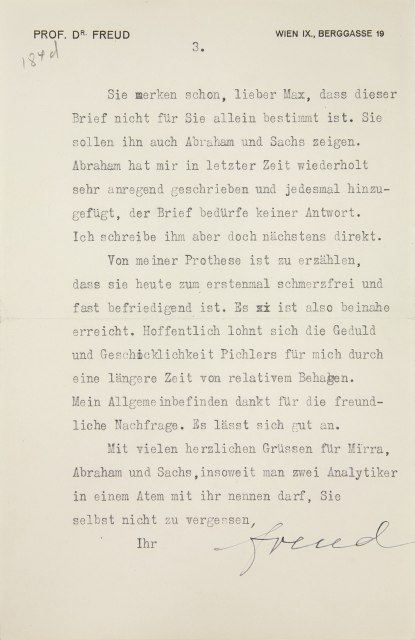 Sie merken schon, lieber Max, daß dieser Brief nicht für Sie allein bestimmt ist. Sie sollen ihn auch Abraham und Sachs zeigen. Abraham hat mir in letzter Zeit wiederholt sehr anregend geschrieben und jedesmal hinzugefügt, der Brief bedürfe keiner Antwort. Ich schreibe ihm aber doch nächstens direkt.