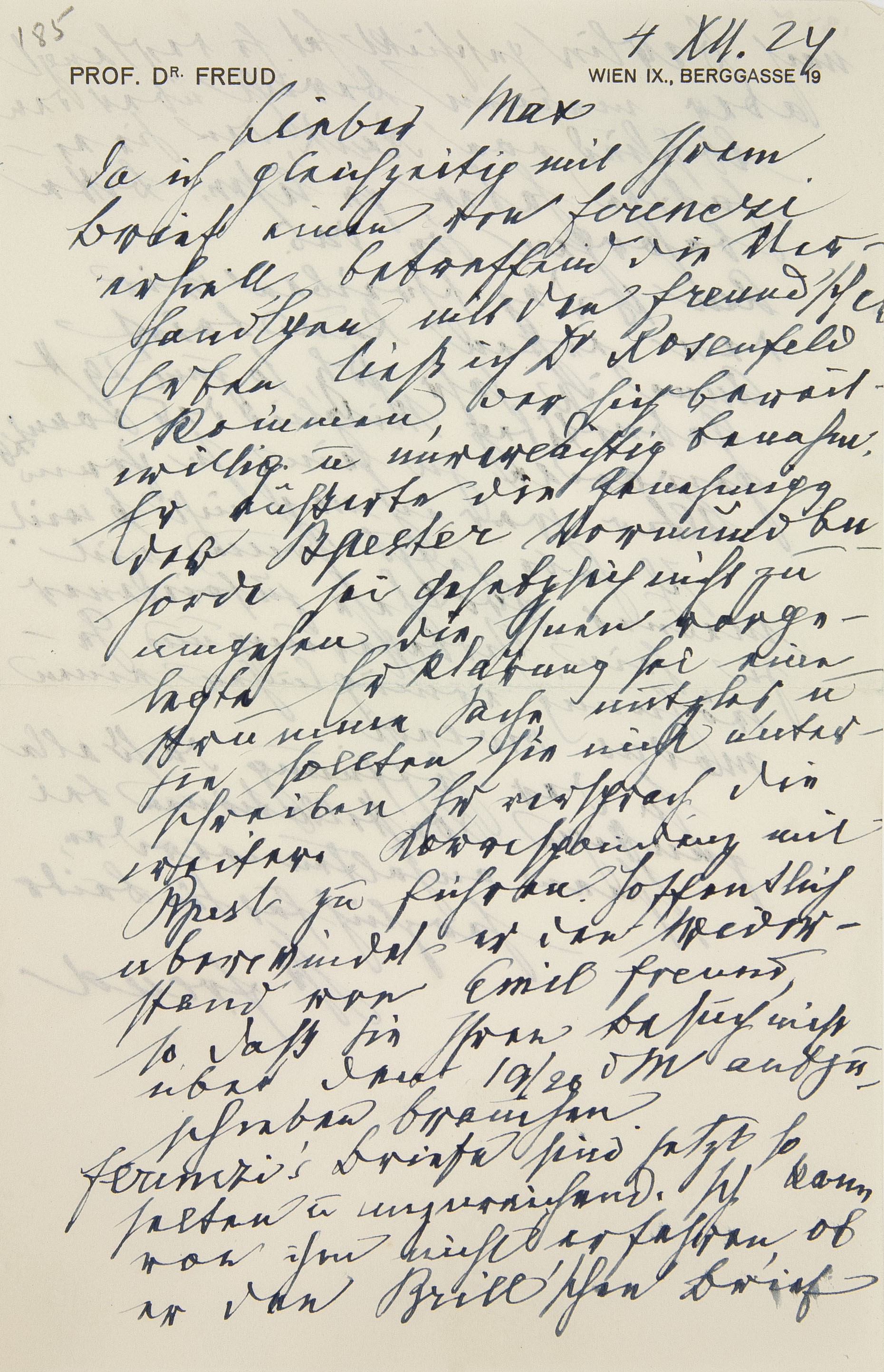 Da ich gleichzeitig mit Ihrem Brief einen von Ferenczi erhielt, betreffend die Verhandlungen mit den Freundschen Erben,1 ließ ich Dr. Rosenfeld kommen, der sich bereitwillig und unverdächtig benahm. Er äußerte, die Genehmigung der Budapester Vormundbehörde sei gesetzlich nicht zu umgehen, die Ihnen vorgelegte Erklärung sei eine krumme Sache, nutzlos, und Sie sollten sie nicht unterschreiben. Er versprach, die weitere Korrespondenz mit Budapest zu führen. Hoffentlich überwindet er den Widerstand von Emil Freund2, so daß Sie Ihren Besuch nicht über den 19./20. d. M. aufzuschieben brauchen.