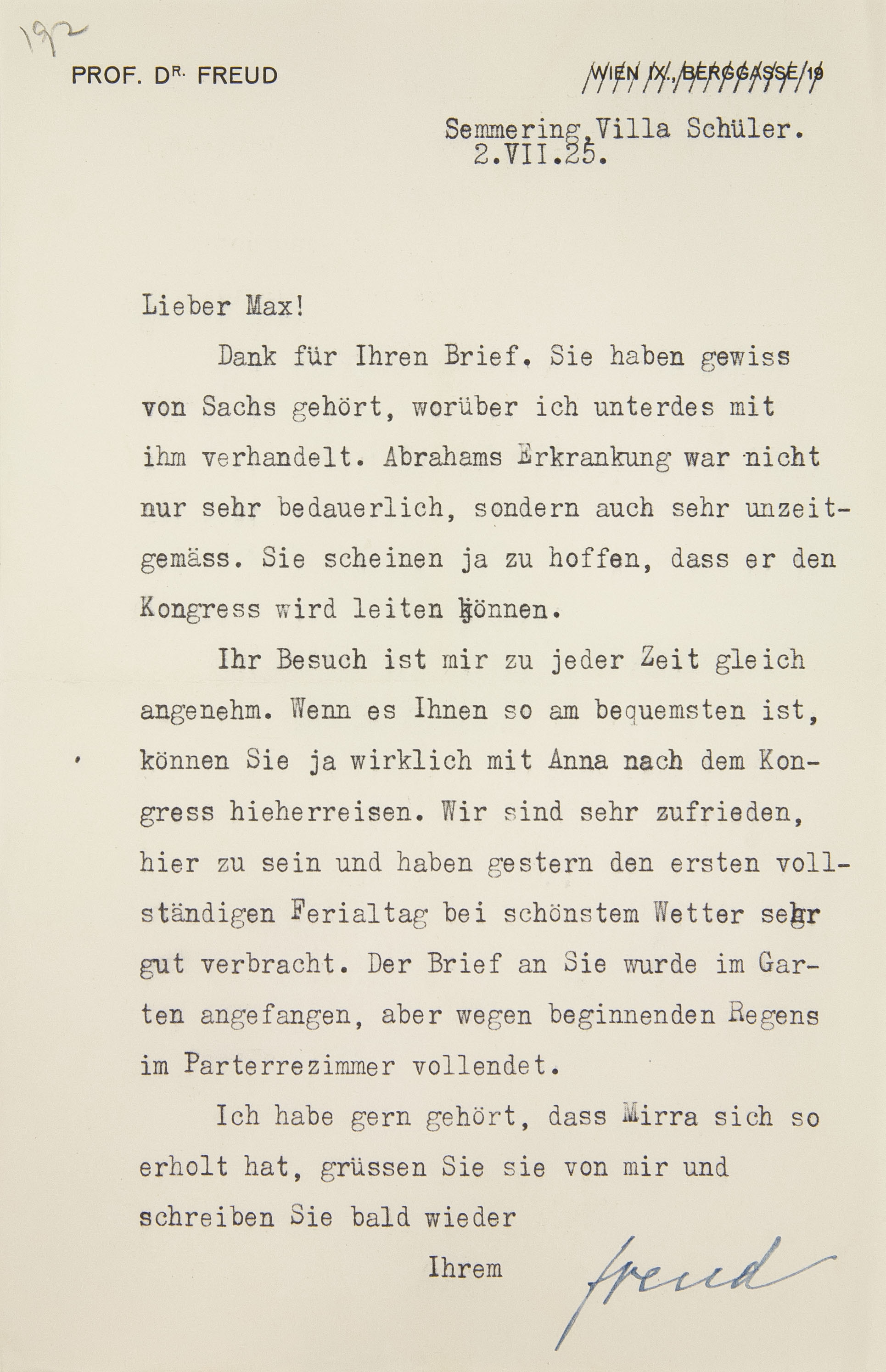 Dank für Ihren Brief. Sie haben gewiß von Sachs gehört, worüber ich unterdes mit ihm verhandelt.1 Abrahams Erkrankung war nicht nur sehr bedauerlich, sondern auch sehr unzeitgemäß. Sie scheinen ja zu hoffen, daß er den Kongreß wird leiten können.