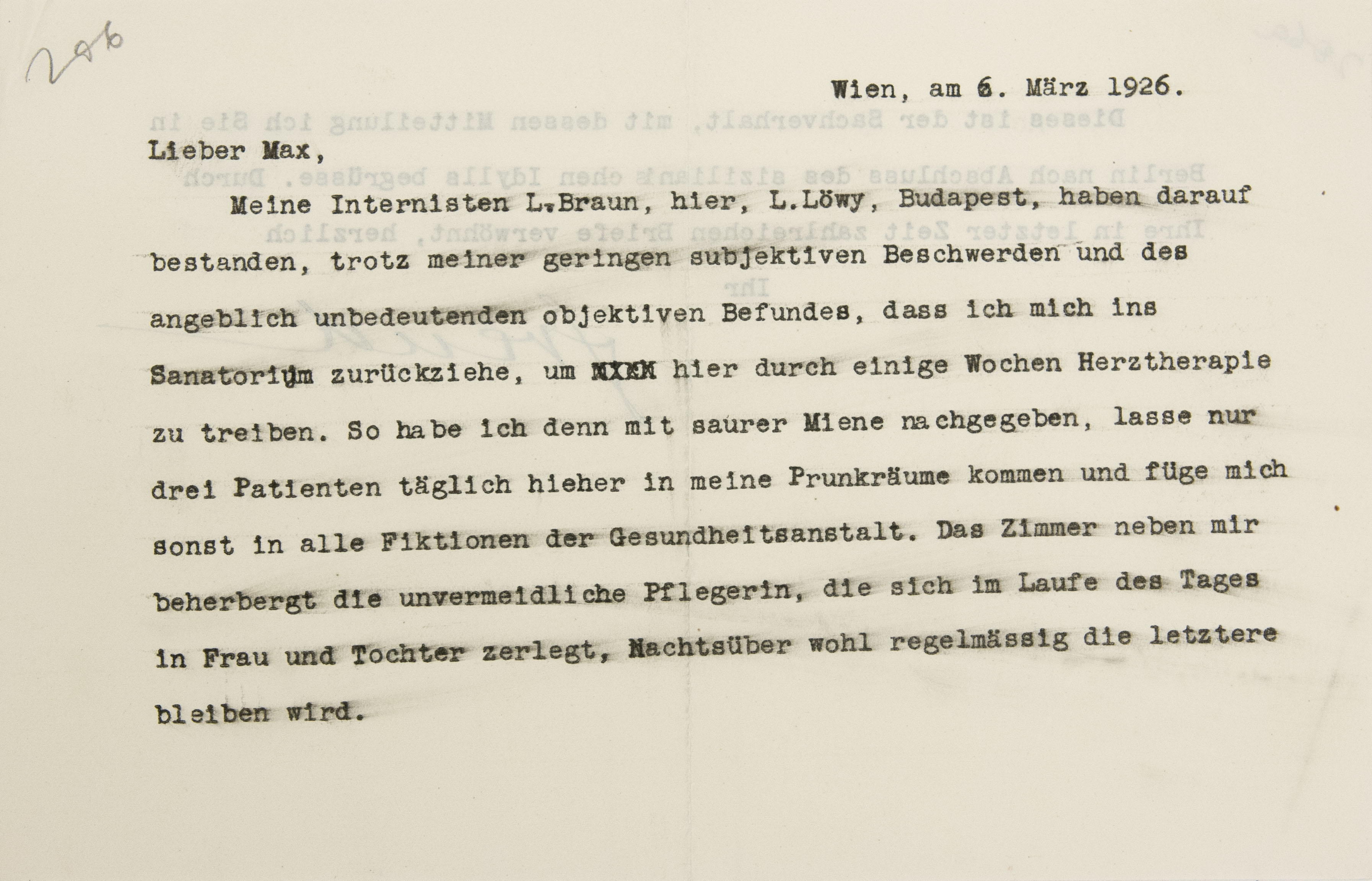 Meine Internisten, L. Braun1 hier, L. Lévyb Budapest,2 haben darauf bestanden, trotz meiner geringen subjektiven Beschwerden und des angeblich unbedeutenden objektiven Befundes, daß ich mich ins Sanatorium3 zurückziehe, um hier durch einige Wochen Herztherapie zu treiben. So habe ich denn mit saurer Miene nachgegeben, lasse nur drei Patienten täglich hieher in meine Prunkräume kommen und füge mich sonst in alle Fiktionen der Gesundheitsanstalt. Das Zimmer neben mir beherbergt die unvermeidliche Pflegerin, die sich im Laufe des Tages in Frau und Tochter zerlegt, nachtsüber wohl regelmäßig die letztere bleiben wird.