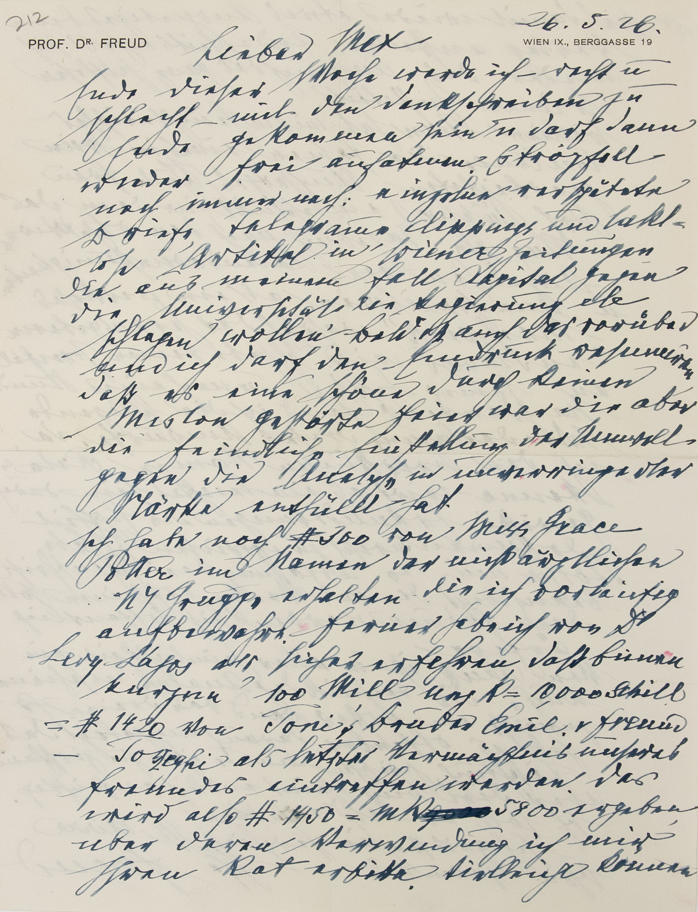 Ich habe noch $ 300 von Miss Grace Potter1 im Namen der nichtärztlichen New Yorker Gruppe2 erhalten, die ich vorläufig aufbewahre. Ferner habe ich von Dr. Lévy Lajos3 als sicher erfahren, daß binnen kurzem 100 Mill. ung. Kronen = 10.000 Schillinge = $ 1420 von Tonis Bruder Emil v. Freund-Tószeghi als letztes Vermächtnis unseres Freundes eintreffen werden. Das wird also $ 1450 = Mka 5800 ergeben,4 über deren Verwendung ich mir Ihren Rat erbitte. Vielleicht können Sie damit wieder etwas Ausgiebiges beim Verlag anstellen. Anderseits erhebt sich wieder derb Anspruch des ganz hilflosen Wiener Instituts.