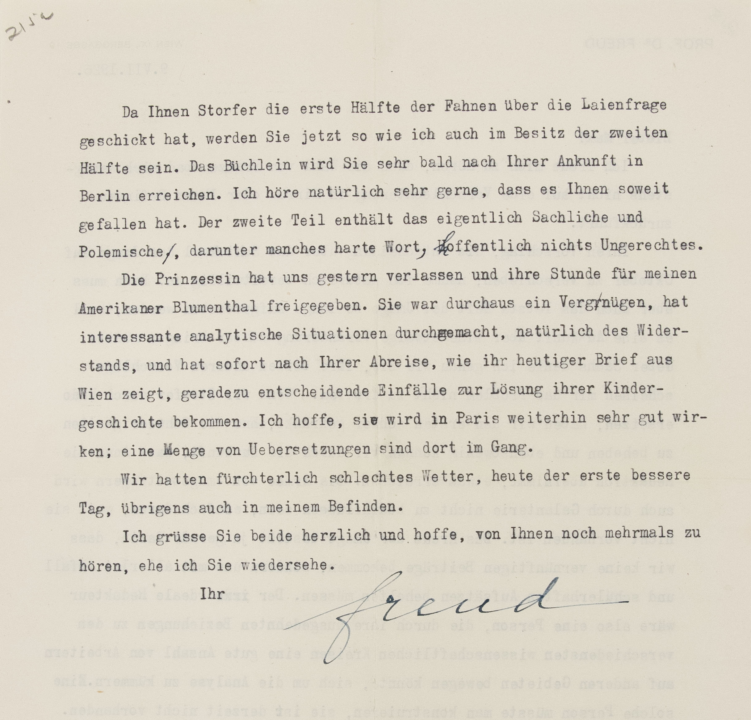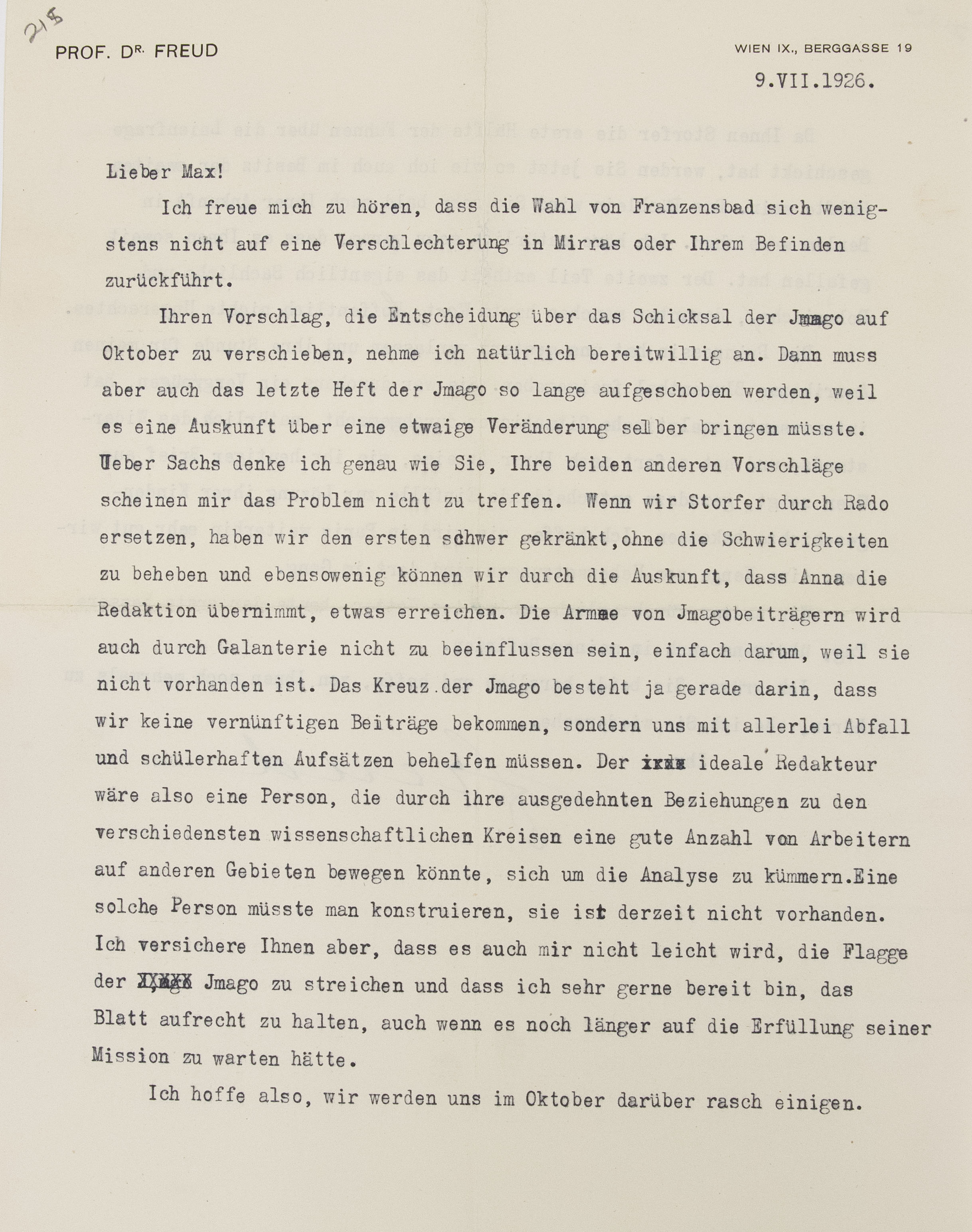 Sigmund Freud Papers: General Correspondence, 1871-1996; Eitingon, M.; From Freud; 1926; Jan.-July