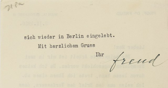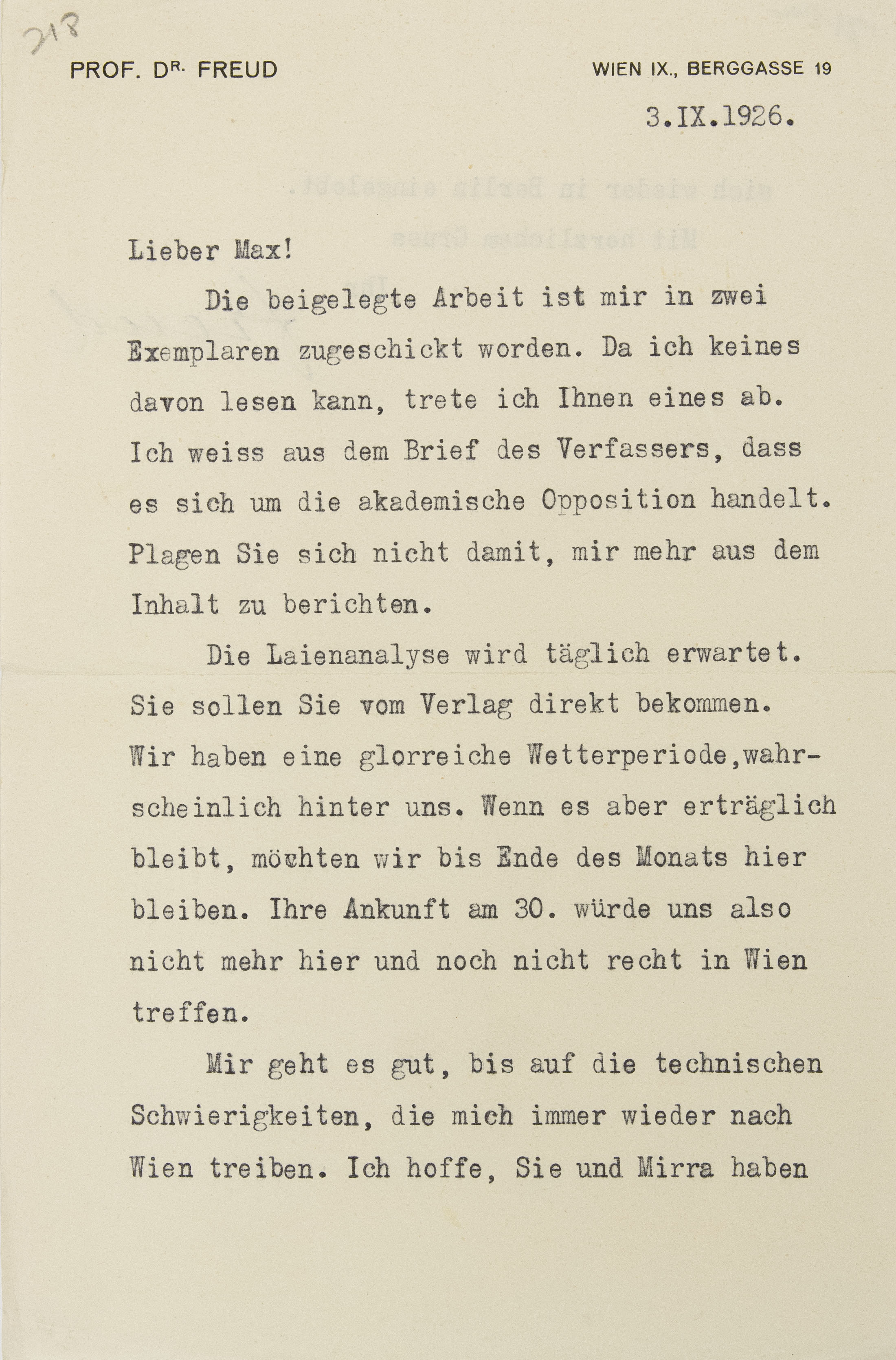 Die ‚Laienanalyse‘ wird täglich erwartet. Sie sollen sie vom Verlag direkt bekommen. Wir haben eine glorreiche Wetterperiode, wahrscheinlich hinter uns. Wenn es aber erträglich bleibt, möchten wir bis Ende des Monats hier bleiben. Ihre Ankunft am 30.2 würde uns also nicht mehr hier und noch nicht recht in Wien treffen.