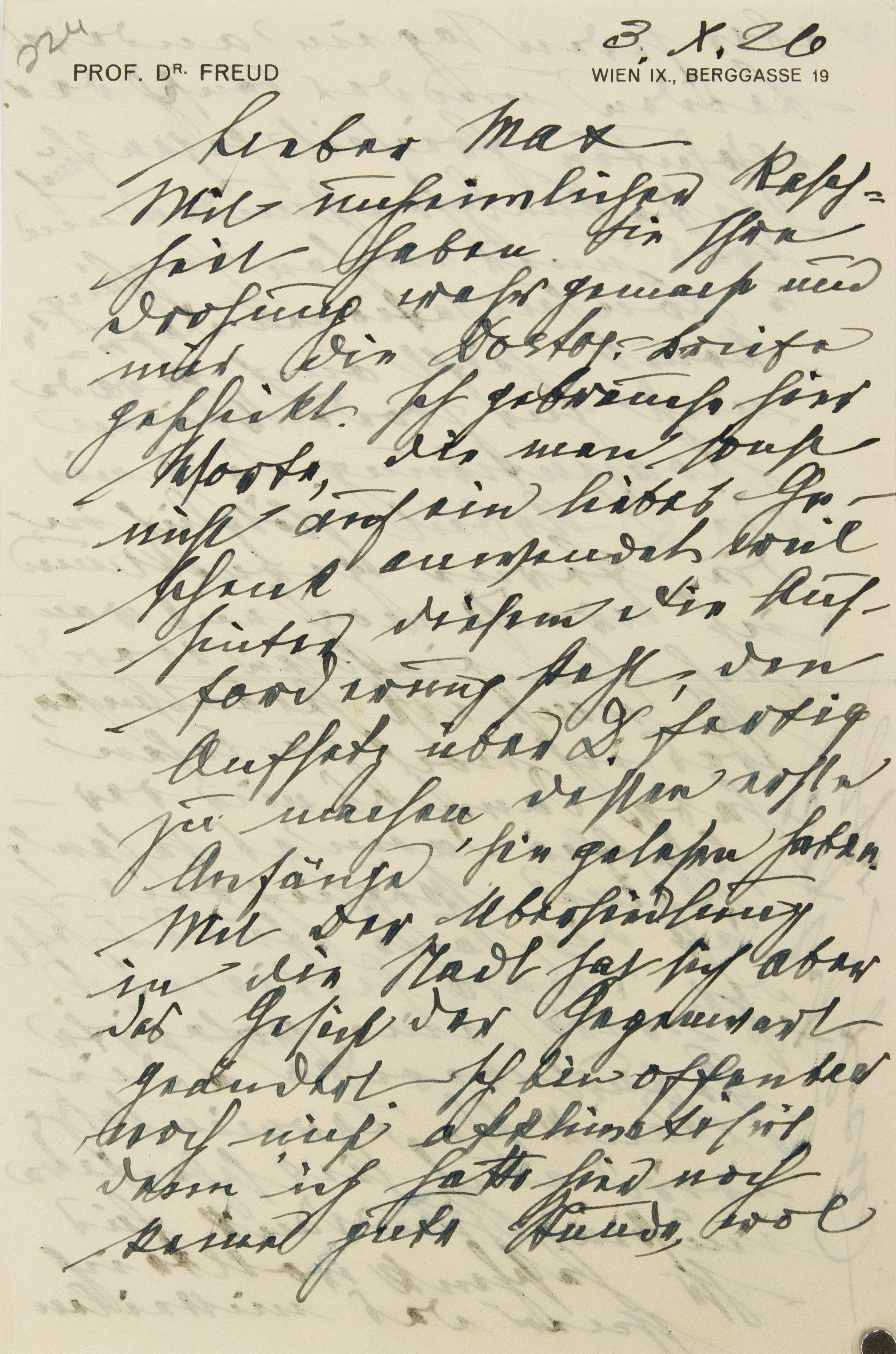 Mit unheimlicher Raschheit haben Sie Ihre Drohung wahr gemacht und mir die Dostojewski-Briefe1 geschickt. Ich gebrauche hier Worte, die man sonst nicht auf ein liebes Geschenk anwendet, weil hinter diesem die Aufforderung steht, den Aufsatz über D[ostojewski]2 fertig zu machen, dessen erste Anfänge Sie gelesen haben. Mit der Übersiedlung in die Stadt hat sich aber das Gesicht der Gegenwart geändert. Ich bin offenbar noch nicht akklimatisiert, denn ich hatte hier noch keine gute Stunde, wohl aber jeden Tag ein anderes Leiden, und der Tausch der absoluten Freiheit gegen fünf feste Analysenstunden, und was immer noch an Empfängen und Konsultationen dazukommt, hilft auch gerade nicht zur produktiven Konzentrierung. So ist mir die D[ostojewski]-Arbeit plötzlich in die Ferne gerückt, und ich weiß noch nicht, wann ich sie einholen werde. Ich muß erst heraussuchen, was ich noch zu lesen habe, dann es mir verschaffen, dann es lesen; keine Möglichkeit, daß die Sache fürs I. Heft der ‚Imago‘ fertig wird. Es wird eine protrahierte Geburt werden, und die Ranksche Terminsetzung3 wird auch hier scheitern müssen. Zum Dank für Ihr Geschenk wollte ich Ihnen das mitteilen.