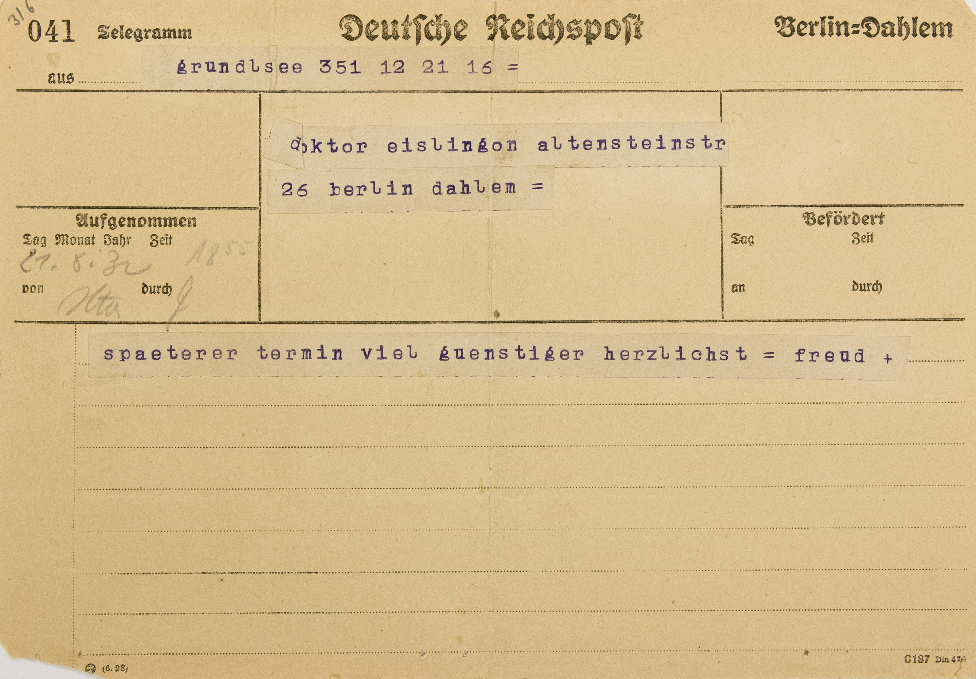 Sigmund Freud Papers: General Correspondence, 1871-1996; Eitingon, M.; From Freud; 1930; May-Aug.