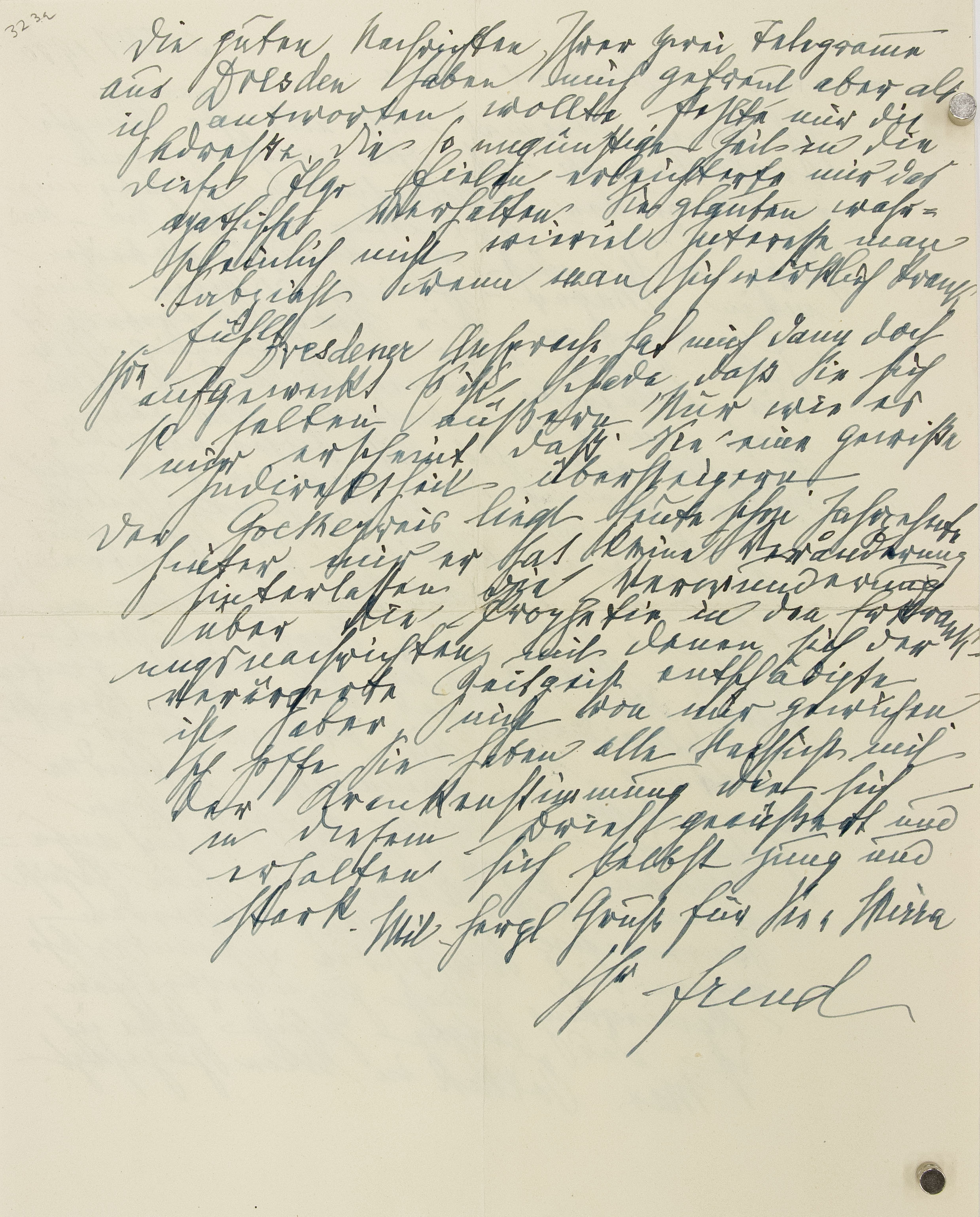 Die guten Nachrichten Ihrer zwei Telegramme aus Dresden haben mich gefreut, aber als ich antworten wollte, fehlte mir die Adresse. Die so ungünstige Zeit, in die diese Telegramme fielen, erleichterte mir das apathische Verhalten. Sie glauben wahrscheinlich nicht, wieviel Interesse man abzieht, wenn man sich wirklich krank fühlt.
