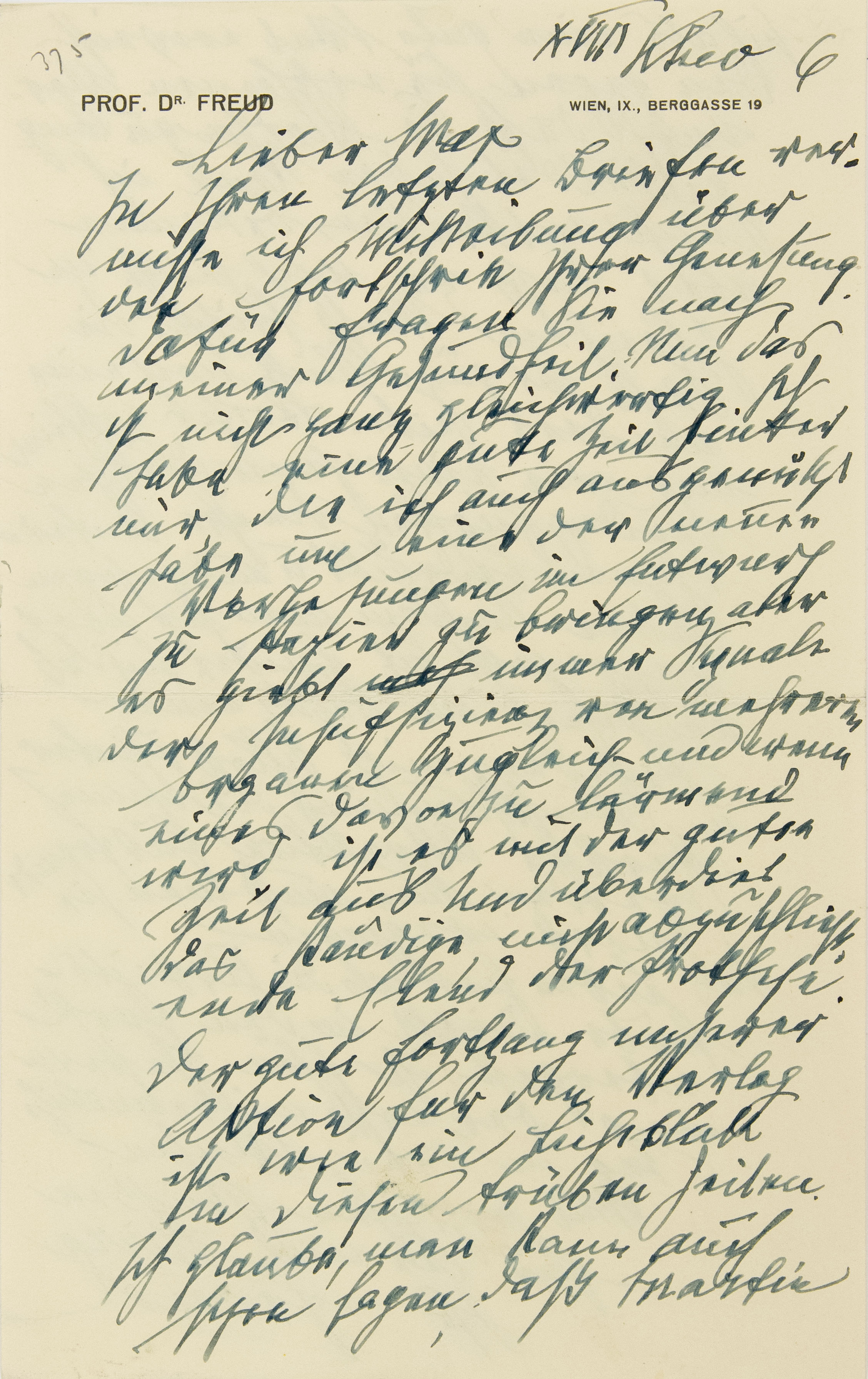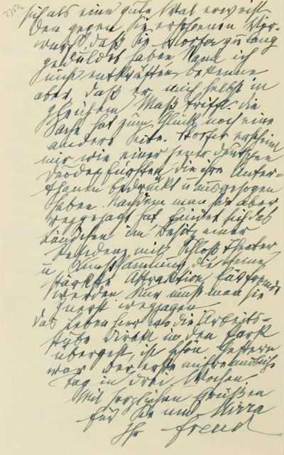 In Ihren letzten Briefen vermisse ich Mitteilung über den Fortschritt Ihrer Genesung. Dafür fragen Sie nach meiner Gesundheit. Nun, das ist nicht ganz gleichwertig. Ich habe eine gute Zeit hinter mir, die ich auch ausgenützt habe, um eine der neuen Vorlesungen1 im Entwurf zu Papier zu bringen, aber es gibtb immer Signale der Insuffizienz von mehreren Organen zugleich – und wenn eines davon zu lärmend wird, ist es mit der guten Zeit aus. Und überdies das ständige, nicht abzuschließende Elend der Prothese.