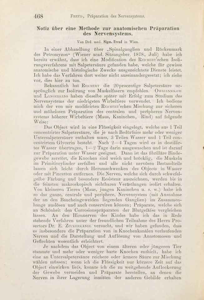 Freud, Sigmund 1879-001/1879 1879a 1879-01 10382 Notiz über eine Methode zur anatomischen Präparation des Nervensystems Centralblatt für die Medicinischen Wissenschaften, 17, 1879, 26 468–469 Fertig Fertig Ganz fertig / zutreffend Fehlt Fehlt Ganz fertig / zutreffend EB