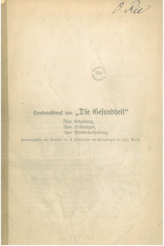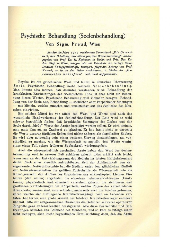 Freud, Sigmund (1905b [ca. 1895-98]): Psychische Behandlung (Seelenbehandlung). In: Die Gesundheit: Ihre Erhaltung, ihre Störungen, ihre Wiederherstellung. Hrsg. von R. Kossmann und J. Weiss, Bd. 1, Stuttgart, Berlin, Leipzig: 1890. GW V, 287-315.