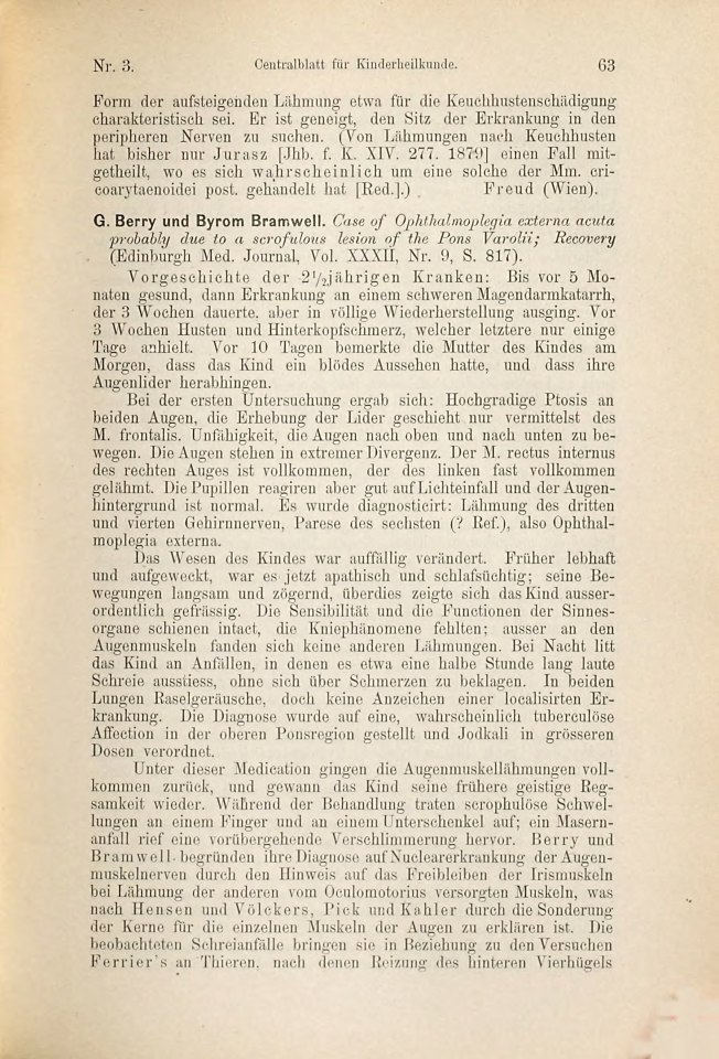 Freud, Sigmund | 1887-214/1887 | 1887t | 1887-17 | Rezension von: Berry, G[eorge Andreas]; Bramwell, Byrom ›Case of Ophthalmoplegia externa acuta probably due to a scrofulous lesion of the Pons Varolii; Recovery‹ | Centralblatt für Kinderheilkunde, 1, 1887, 3 | 63–64 | Fertig ✔ | Fertig ✔ | Ganz fertig / zutreffend ✔ | Fehlt ✖ | Fehlt ✖ | Ganz fertig / zutreffend ✔ | ✔ | EB | ✔ | ||