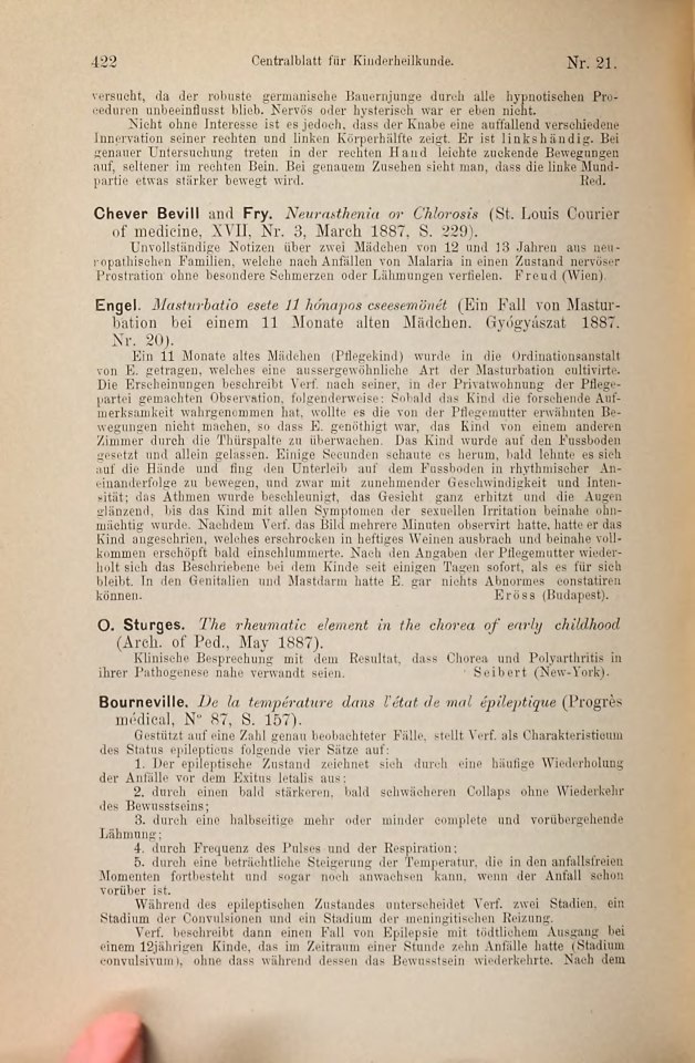Freud, Sigmund | 1887-240/1887 | 1887ee | 1887-29 | Rezension von: Bevill, Chever; Fry, [Henry D.] ›Neurasthenia or Chlorosis‹ | Centralblatt für Kinderheilkunde, 1, 1887, 21 | 422 | Fertig ✔ | Fertig ✔ | Ganz fertig / zutreffend ✔ | Fehlt ✖ | Fehlt ✖ | Ganz fertig / zutreffend ✔ | ✔ | EB | ✔ | ||