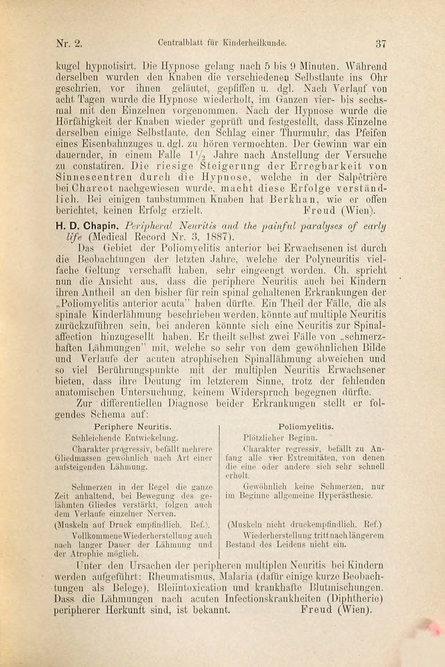Freud, Sigmund | 1887-209/1887 | 1887o | 1887-12 | Rezension von: Chapin, H[enry] D[wight] ›Peripheral Neuritis and the painful paralyses of early life‹ | Centralblatt für Kinderheilkunde, 1, 1887, 2 | 37 | Fertig ✔ | Fertig ✔ | Ganz fertig / zutreffend ✔ | Fehlt ✖ | Fehlt ✖ | Ganz fertig / zutreffend ✔ | ✔ | EB | ✔ | ||