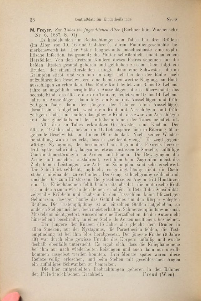 Freud, Sigmund | 1887-210/1887 | 1887p | 1887-13 | Rezension von: Freyer, M[oritz] ›Zur Tabes im jugendlichen Alter‹ | Centralblatt für Kinderheilkunde, 1, 1887, 2 | 38 | Fertig ✔ | Fertig ✔ | Ganz fertig / zutreffend ✔ | Fehlt ✖ | Fehlt ✖ | Ganz fertig / zutreffend ✔ | ✔ | EB | ✔ | ||