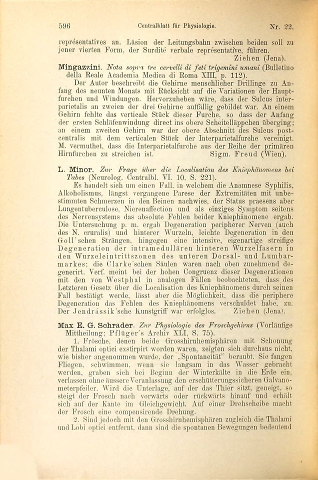 Freud, Sigmund 1888-201/1888 1888s 1888-24 Rezension von: Mingazzini, [Giovanni] ›Nota sopra tre cervelli di feti trigemini umani‹ Centralblatt für Physiologie, 1, 1888, 22 596 Fertig Fertig Ganz fertig / zutreffend Fehlt Fehlt Ganz fertig / zutreffend EB