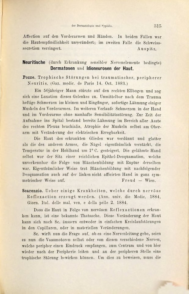 Freud, Sigmund | 1885-202/1885 | 1885h | 1885-08 | Rezension von: Pozze ›Trophische Störungen bei traumatischer, peripherer Neuritis‹ | Vierteljahresschrift für Dermatologie und Syphilis. Neue Folge des Archivs für Dermatologie und Syphilis, 12, 1885, 2 | 315 | Fertig ✔ | Fertig ✔ | Ganz fertig / zutreffend ✔ | Fehlt ✖ | Fehlt ✖ | Ganz fertig / zutreffend ✔ | ✔ | EB | ✔ | ||