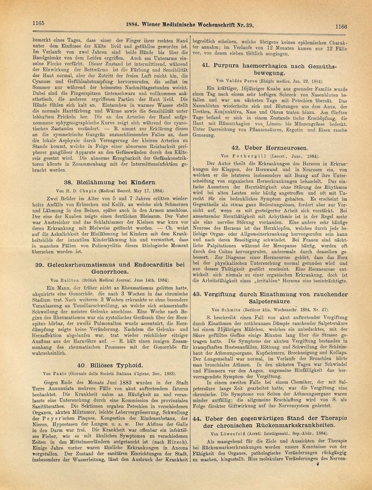 Freud, Sigmund | 1884-238/1884 | 1884uu | 1884-46 | Rezension [unsigniert] von: Chapin, H. D. ›Bleilähmung bei Kindern‹ | Wiener Medizinische Wochenschrift, 1884, 34, 39 | 1165 | Fertig ✔ | Fertig ✔ | Ganz fertig / zutreffend ✔ | Fehlt ✖ | Fehlt ✖ | Ganz fertig / zutreffend ✔ | ✔ | EB | ✔ | ||