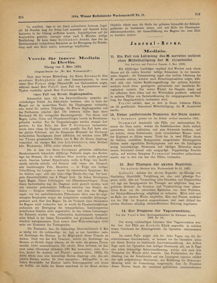 Freud, Sigmund 1884-211/1884 1884t 1884-19 Rezension [unsigniert] von: Dalton und Ferrier ›Ein Fall von Lähmung des M. serratus anticus ohne Mitbetheiligung der M. rhomboidei‹. Wiener Medizinische Wochenschrift, 34, 1884, 11 316 Fertig Fertig Ganz fertig / zutreffend Fehlt Fehlt Ganz fertig / zutreffend EB