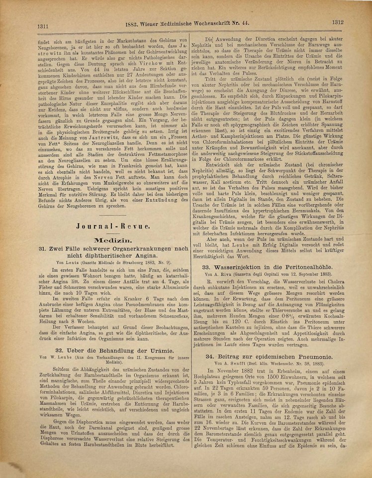 Freud, Sigmund | 1883-206/1883 | 1883f | 1883-06 | Rezension [unsigniert] von: Leube, W. ›Über die Behandlung der Urämie‹ | Wiener Medizinische Wochenschrift, 33, 1883, 44 | 1311–1312 | Fertig ✔ | Fertig ✔ | Ganz fertig / zutreffend ✔ | Fehlt ✖ | Fehlt ✖ | Ganz fertig / zutreffend ✔ | ✔ | EB | ✔ | ||