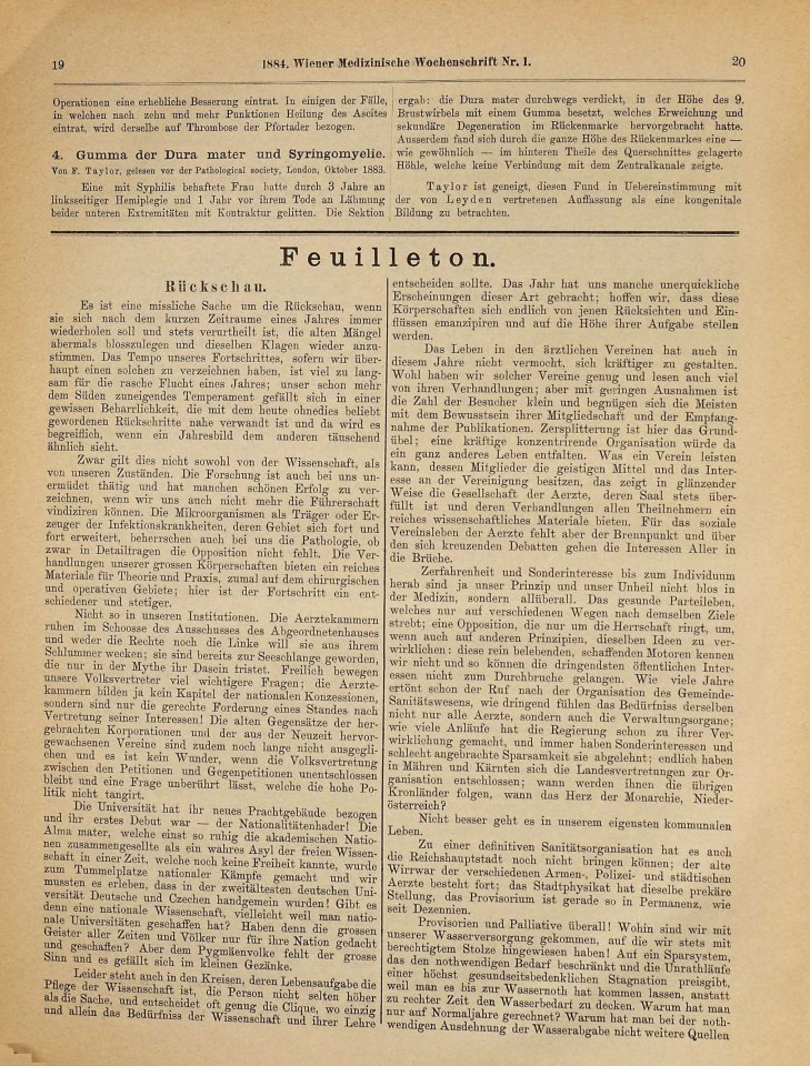 Freud, Sigmund | 1884-204/1884 | 1884m | 1884-12 | Rezension [unsigniert] von: Taylor, F. ›Gumma der Dura mater und Syringomyelie‹ | Wiener Medizinische Wochenschrift, 34, 1884, 1 | 19–20 | Fertig ✔ | Fertig ✔ | Ganz fertig / zutreffend ✔ | Fehlt ✖ | Fehlt ✖ | Ganz fertig / zutreffend ✔ | ✔ | EB | ✔ | ||