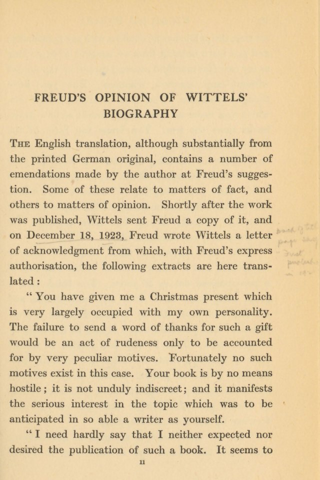 | Freud, Sigmund | 1924-071/1924 | 1924g [1923] | 10415 | Freud’s Opinion of Wittels Biography | Wittels, Fritz: Sigmund Freud. His personality, his teaching, & his school. London, Woking: George Allen & Unwin Ltd. 1924 | 11–13 | Fertig ✔ | Fertig ✔ | Ganz fertig / zutreffend ✔ | Fehlt ✖ | Fehlt ✖ | Ganz fertig / zutreffend ✔ | ✔ | EB | ✔ | ||