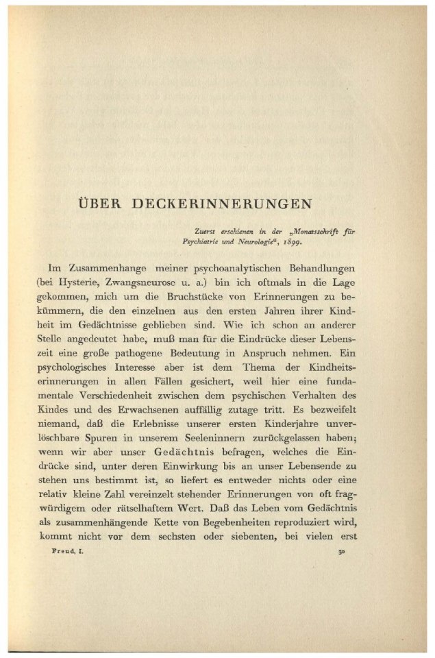 Freud, Sigmund | 1899-001/1899 | 1899a | 1899-01 | 10426 | Ueber Deckerinnerungen | Monatsschrift für Psychiatrie und Neurologie, 6, 1899, 3 | 215–230 | Fertig ✔ | Fertig ✔ | Ganz fertig / zutreffend ✔ | Fehlt ✖ | Fehlt ✖ | Ganz fertig / zutreffend ✔ | ✔ | EB | ✔ | |