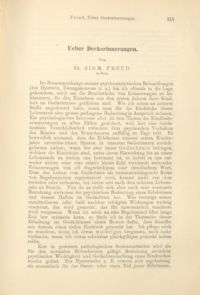 Freud, Sigmund | 1899-001/1899.2 | Über Deckerinnerungen | Separatum Monatsschrift für Psychiatrie und Neurologie, 6, 1899, 3 | 215–230 | Fertig ✔ | Fertig ✔ | Ganz fertig / zutreffend ✔ | Fehlt ✖ | Fehlt ✖ | Ganz fertig / zutreffend ✔ | ✔ | EB | ✔ | ||||