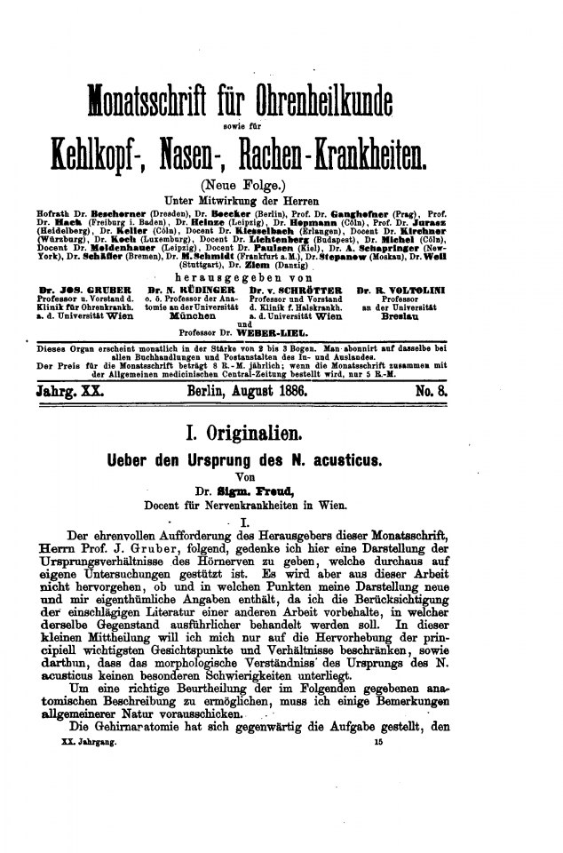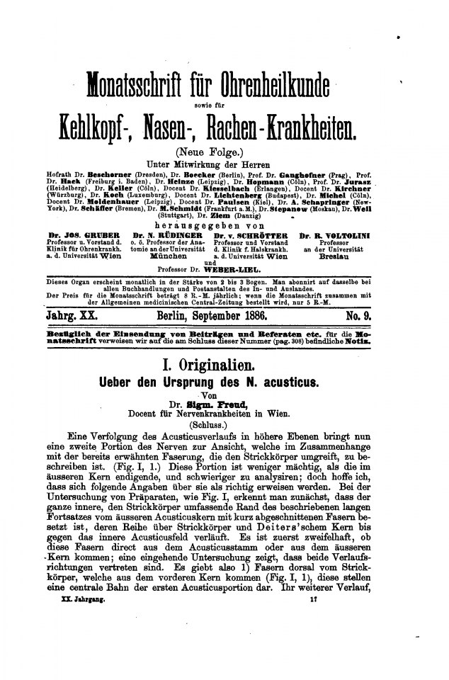 Freud, Sigmund | 1886-003/1886 | 1886c | 1886-03 | 10387 | Ueber den Ursprung des N. acusticus | Mschr. Ohrenhk. 20(8) | 245–251 | Fertig ✔ | Fertig ✔ | Ganz fertig / zutreffend ✔ | Fehlt ✖ | Fehlt ✖ | Ganz fertig / zutreffend ✔ | ✔ | EB | ✔ | |