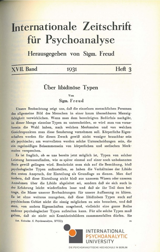 Freud, Sigmund | 1931-001/1948 | 10525 | Über libidinöse Typen | GW 14 | 507–513 | Fertig ✔ | Nicht erforderlich/ | Nicht erforderlich/ | Nicht erforderlich/ | Nicht erforderlich/ | Nicht erforderlich/ | ✔ | ✔ | ||||