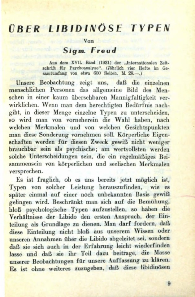 Freud, Sigmund | 1931-001/1972 | 1931a | Über libidinöse Typen | SA 5 | 267–272 | Fertig ✔ | Nicht erforderlich/ | Nicht erforderlich/ | Nicht erforderlich/ | Nicht erforderlich/ | Nicht erforderlich/ | ✔ | ✔ | ||||