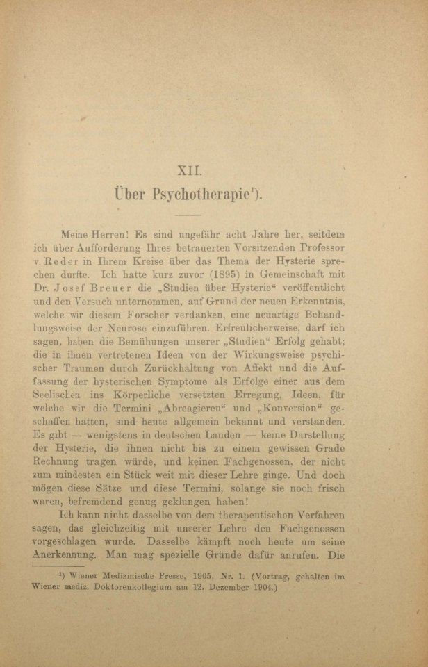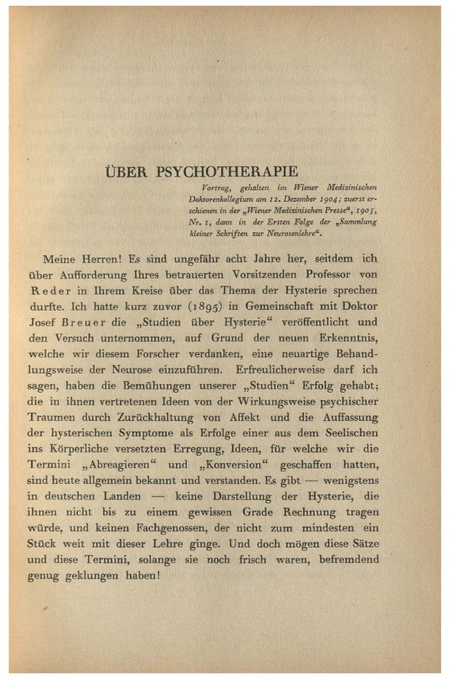 Freud, Sigmund | 1905-001/1942 | 1905a [1904] | 10586 | Über Psychotherapie | GW 5 | 11–26 | Fertig ✔ | Nicht erforderlich/ | Nicht erforderlich/ | Nicht erforderlich/ | Nicht erforderlich/ | Nicht erforderlich/ | ✔ | ✔ | |||