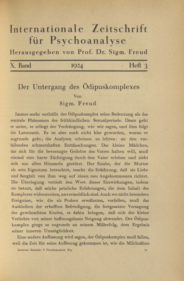 Freud, Sigmund | 1924-003/1940 | 1924d | 10622 | Der Untergang des Ödipuskomplexes | GW 13 | 393–402 | Fertig ✔ | Nicht erforderlich/ | Nicht erforderlich/ | Nicht erforderlich/ | Nicht erforderlich/ | Nicht erforderlich/ | ✔ | ✔ | |||
