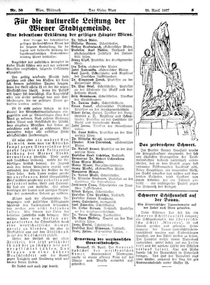 Freud, Sigmund 1927-051/1927.2 1927l 1927-06 Für die kulturelle Leistung der Wiener Stadtgemeinde Das Kleine Blatt, 1, , 50 5 Fertig Fertig Ganz fertig / zutreffend Fehlt Fehlt Ganz fertig / zutreffend EB