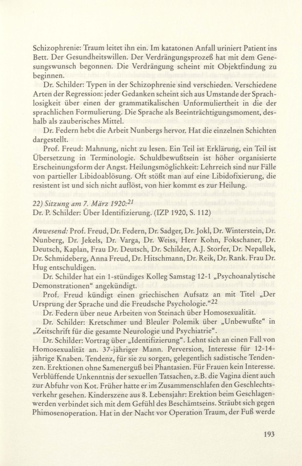 Anwesend: Prof. Freud, Dr. Federn, Dr. Sadger, Dr. Jokl, Dr. Winterstein, Dr.
