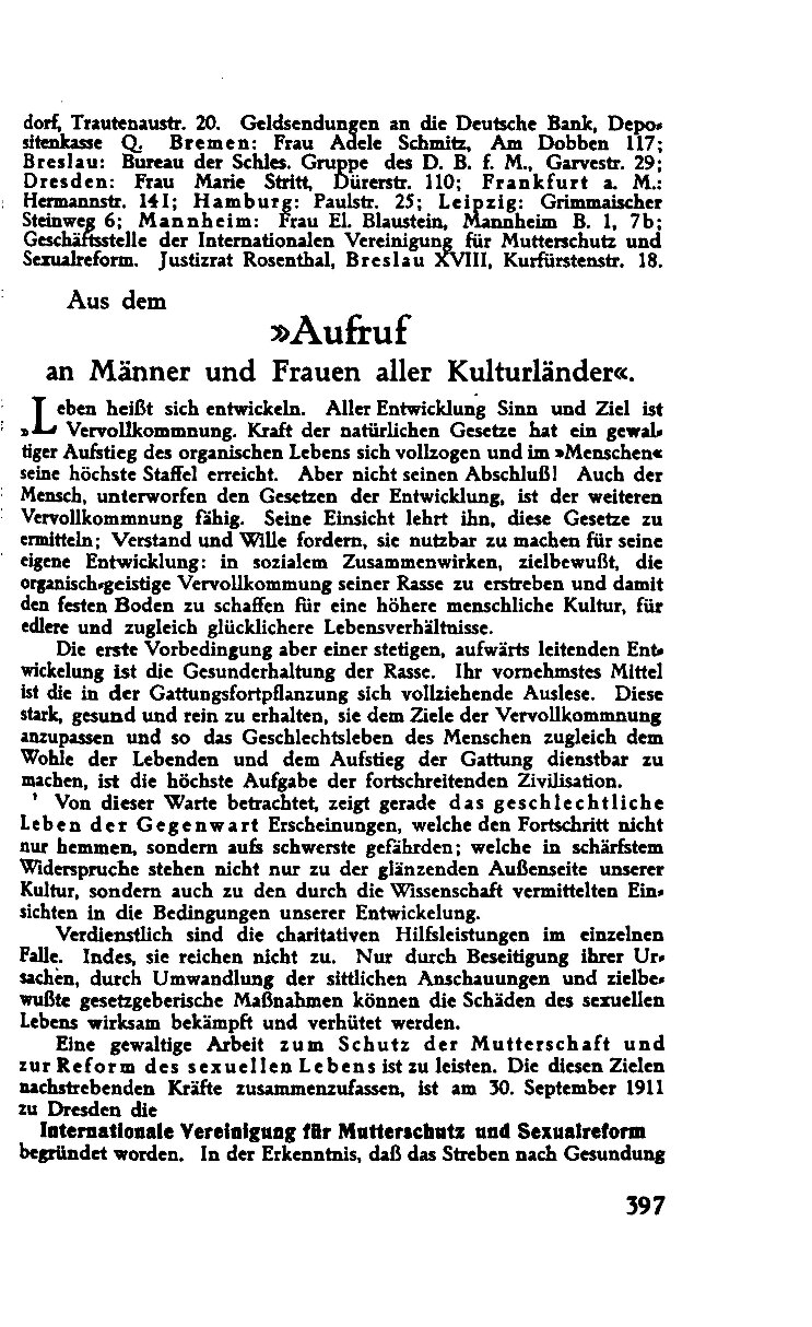 und Aufruf der »Internationalen Vereinigung für Mutterschutz und