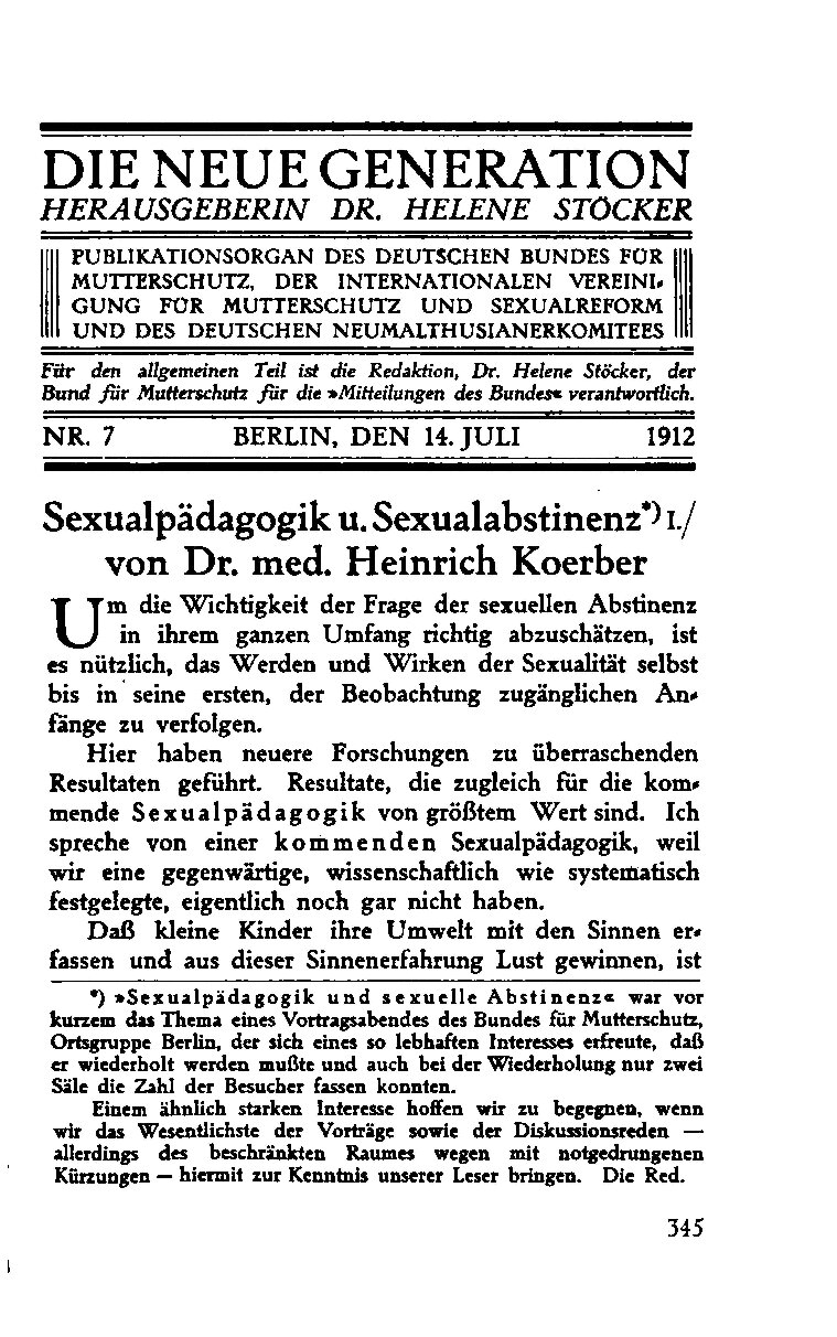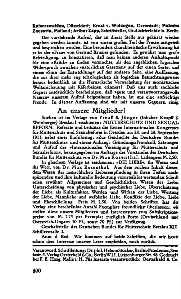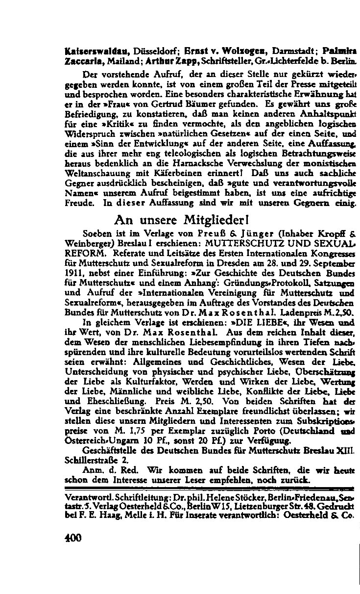 Verantwortl. Schriftleitung: Dr. phil. Helene Stöcker, Berlin-Friedenau, Sedan-