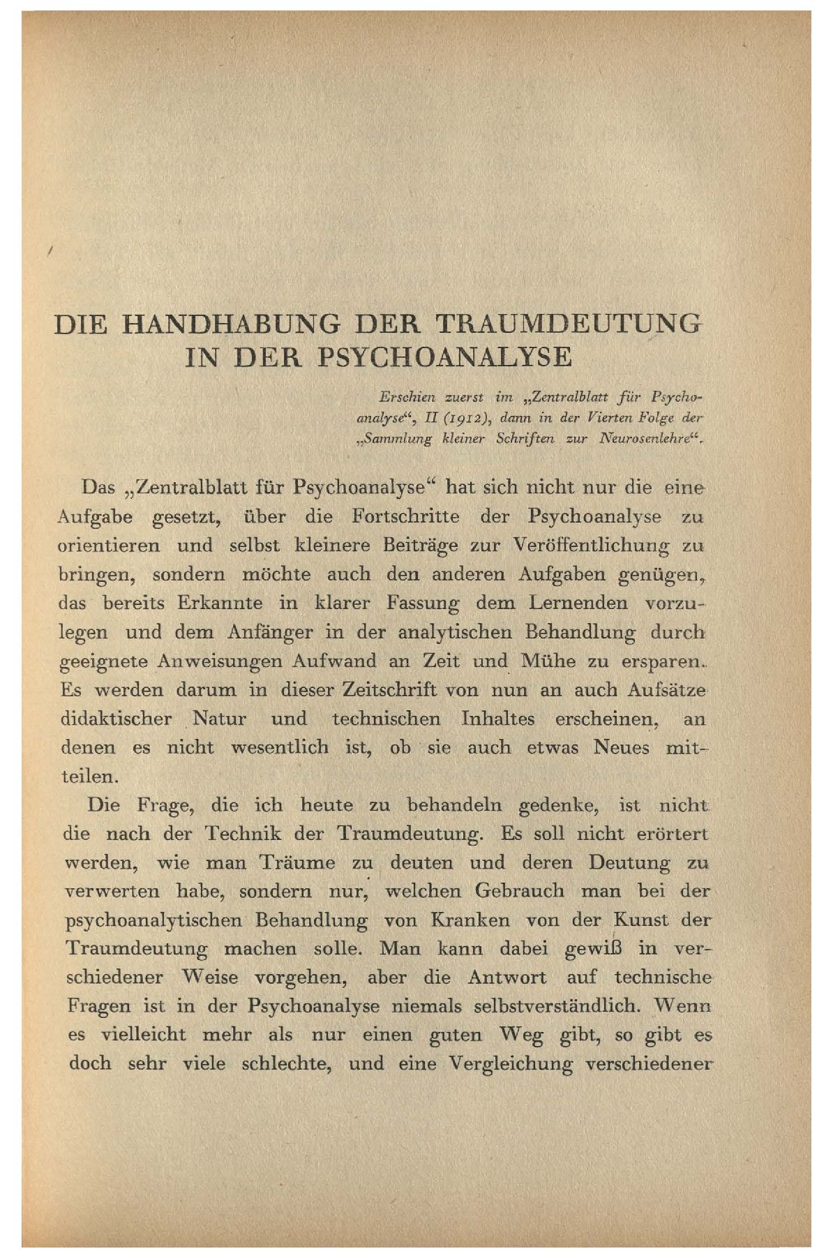 In den „wissenschaftlichen“ Arbeiten über den Traum, die trotz der Ablehnung der Traumdeutung einen neuen Impuls durch die Psychoanalyse empfangen haben, findet man immer wieder eine recht überflüssige Sorgfalt auf die getreue Erhaltung des Traumtextes verlegt, der angeblich vor den Entstellungen