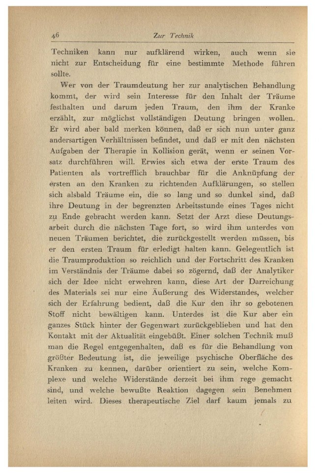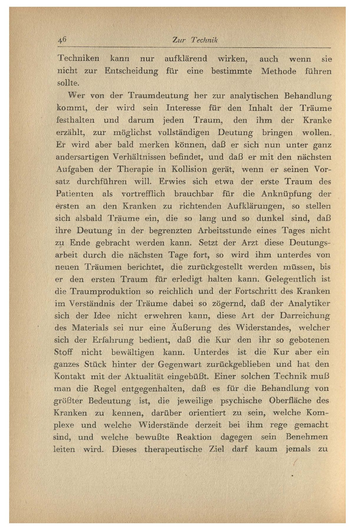 Wer von der Traumdeutung her zur analytischen Behandlung kommt, der wird sein Interesse für den Inhalt der Träume festhalten und darum jeden Traum, den ihm der Kranke erzählt, zur möglichst vollständigen Deutung bringen wollen. Er wird aber bald merken können, daß er sich nun unter ganz andersartigen Verhältnissen befindet, und daß er mit den nächsten Aufgaben der Therapie in Kollision gerät, wenn er seinen Vorsatz durchführen will. Erwies sich etwa der erste Traum des Patienten als vortrefflich brauchbar für die Anknüpfung der ersten an den Kranken zu richtenden Aufklärungen, so stellen sich alsbald Träume ein, die so lang und so dunkel sind, daß ihre Deutung in der begrenzten Arbeitsstunde eines Tages nicht zu Ende gebracht werden kann. Setzt der Arzt diese Deutungsarbeit durch die nächsten Tage fort, so wird ihm unterdes von neuen Träumen berichtet, die zurückgestellt werden müssen, bis er den ersten Traum für erledigt halten kann. Gelegentlich ist die Traumproduktion so reichlich und der Fortschritt des Kranken im Verständnis der Träume dabei so zögernd, daß der Analytiker sich der Idee nicht erwehren kann, diese Art der Darreichung des Materials sei nur eine Äußerung des Widerstandes, welcher sich der Erfahrung bedient, daß die Kur den ihr so gebotenen Stoff nicht bewältigen kann. Unterdes ist die Kur aber ein ganzes Stück hinter der Gegenwart zurückgeblieben und hat den Kontakt mit der Aktualität eingebüßt. Einer solchen Technik muß man die Regel entgegenhalten, daß es für die Behandlung von größter Bedeutung ist, die jeweilige psychische Oberfläche des Kranken zu kennen, darüber orientiert zu sein, welche Komplexe und welche Widerstände derzeit bei ihm rege gemacht sind, und welche bewußte Reaktion dagegen sein Benehmen leiten wird. Dieses therapeutische Ziel darf kaum jemals zu