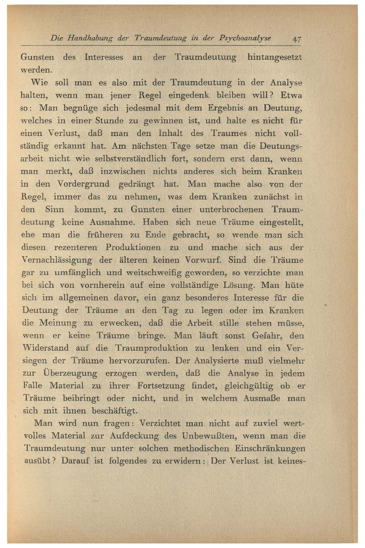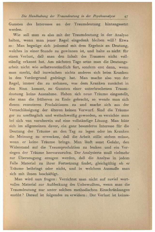 Man wird nun fragen: Verzichtet man nicht auf zuviel wertvolles Material zur Aufdeckung des Unbewußten, wenn man die Traumdeutung nur unter solchen methodischen Einschränkungen ausübt? Darauf ist folgendes zu erwidern: Der Verlust ist keineswegs