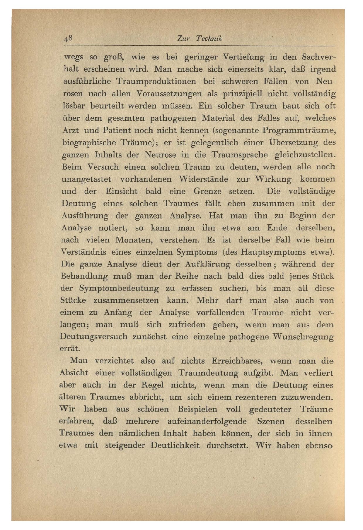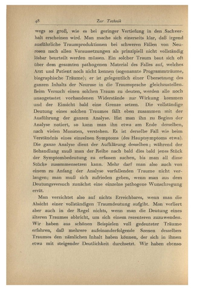 so groß, wie es bei geringer Vertiefung in den Sachverhalt erscheinen wird. Man mache sich einerseits klar, daß irgend ausführliche Traumproduktionen bei schweren Fällen von Neurosen nach allen Voraussetzungen als prinzipiell nicht vollständig lösbar beurteilt werden müssen. Ein solcher Traum baut sich oft über dem gesamten pathogenen Material des Falles auf, welches Arzt und Patient noch nicht kennen (sogenannte Programmträume, biographische Träume); er ist gelegentlich einer Übersetzung des ganzen Inhalts der Neurose in die Traumsprache gleichzustellen. Beim Versuch einen solchen Traum zu deuten, werden alle noch unangetastet vorhandenen Widerstände zur Wirkung kommen und der Einsicht bald eine Grenze setzen. Die vollständige Deutung eines solchen Traumes fällt eben zusammen mit der Ausführung der ganzen Analyse. Hat man ihn zu Beginn der Analyse notiert, so kann man ihn etwa am Ende derselben, nach vielen Monaten, verstehen. Es ist derselbe Fall wie beim Verständnis eines einzelnen Symptoms (des Hauptsymptoms etwa). Die ganze Analyse dient der Aufklärung desselben; während der Behandlung muß man der Reihe nach bald dies bald jenes Stück der Symptombedeutung zu erfassen suchen, bis man all diese Stücke zusammensetzen kann. Mehr darf man also auch von einem zu Anfang der Analyse vorfallenden Traume nicht verlangen; man muß sich zufrieden geben, wenn man aus dem Deutungsversuch zunächst eine einzelne pathogene Wunschregung errät.