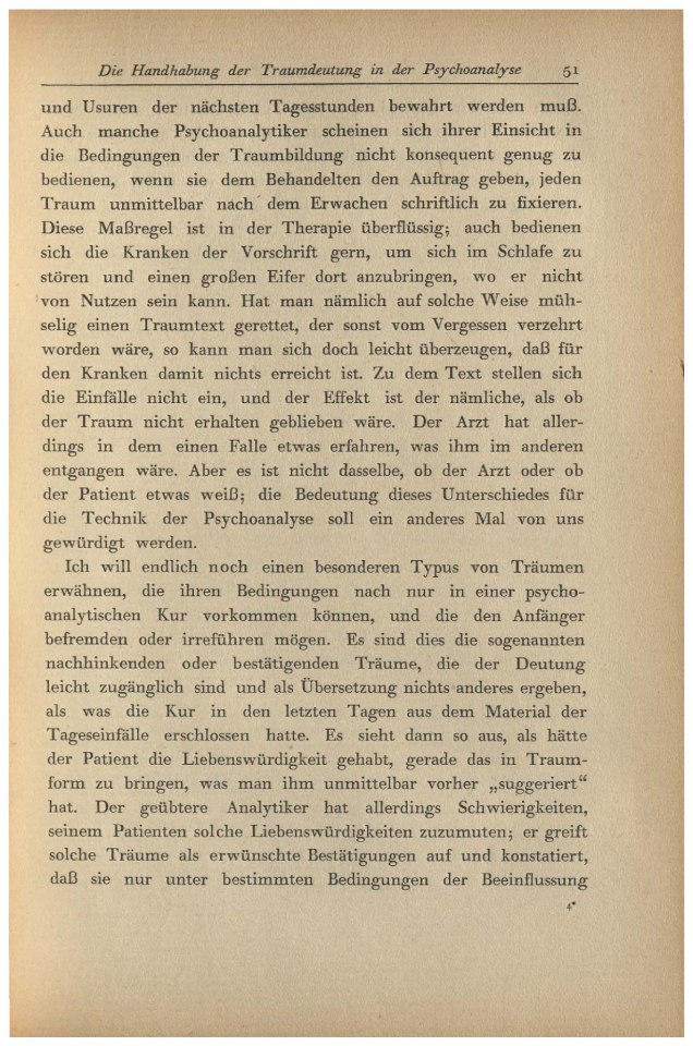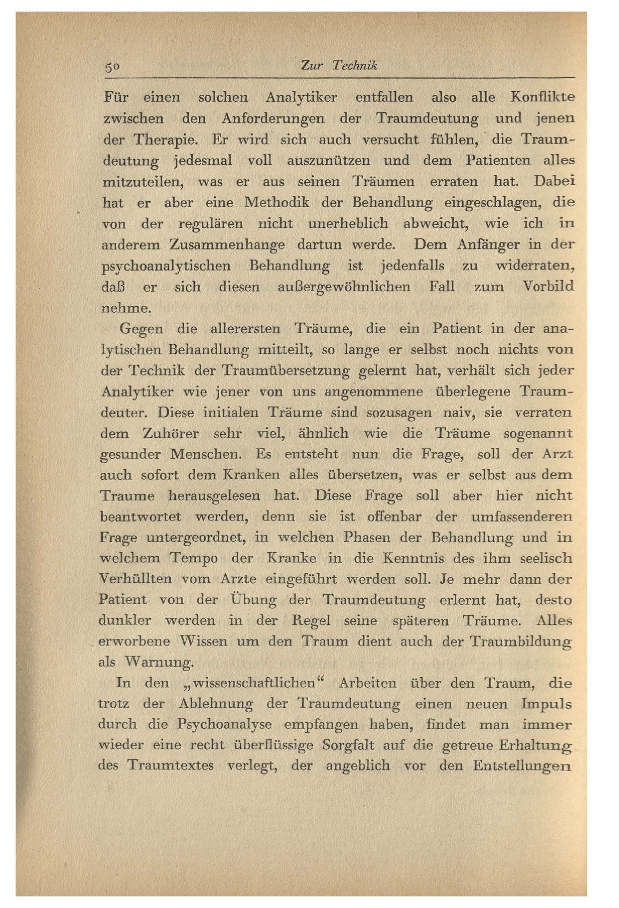 Für einen solchen Analytiker entfallen also alle Konflikte zwischen den Anforderungen der Traumdeutung und jenen der Therapie. Er wird sich auch versucht fühlen, die Traumdeutung jedesmal voll auszunützen und dem Patienten alles mitzuteilen, was er aus seinen Träumen erraten hat. Dabei hat er aber eine Methodik der Behandlung eingeschlagen, die von der regulären nicht unerheblich abweicht, wie ich in anderem Zusammenhange dartun werde. Dem Anfänger in der psychoanalytischen Behandlung ist jedenfalls zu widerraten, daß er sich diesen außergewöhnlichen Fall zum Vorbild nehme.