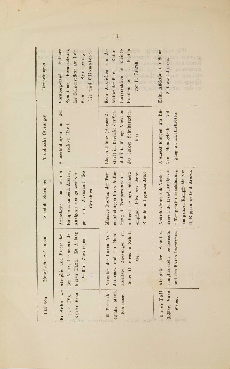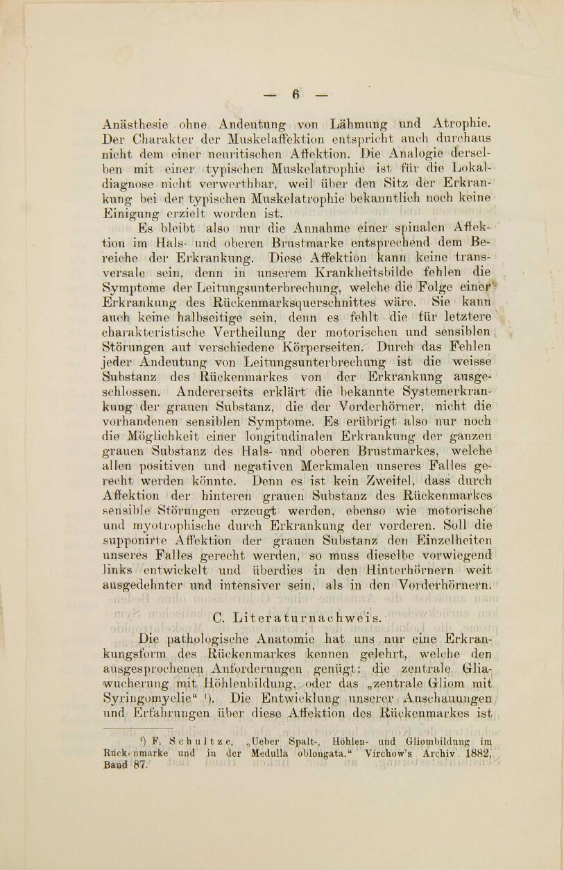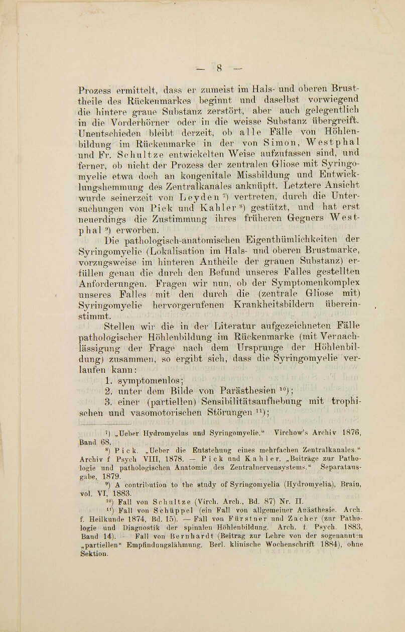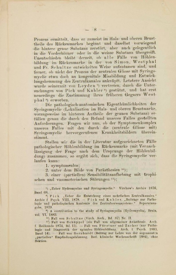 10) Fall von Schultze (Virch. Arch., Bd. 87) Nr. II. 1) Fall von Schüppel (ein Fall von allgemeiner Anästhesie. Arch. f. Heilkunde 1874, Bd. 15). Fall von Fürstner und Zacher (zur Patho logie und Diagnostik der spinalen Höhlenbildung. Arch. t. Psych. 1883, Band 14). Fall von Bernhardt (Beitrag zur Lehre von der sogenannten -partiellen Empfindungslähmung. Berl. klinische Wochenschrift 1884), ohne Sektion.