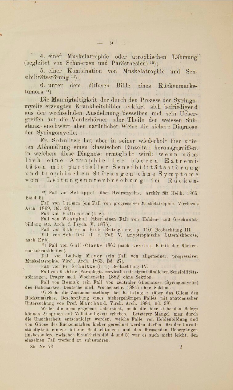 Muskelatrophie. Virch. Arch. 1-63, Bd. 27). Fall von Fr Schultze (1. e) Beobachtung IV. Fall von Kahler (Paraplegia cervicalis mit eigenthümlichen Sensibilitäts