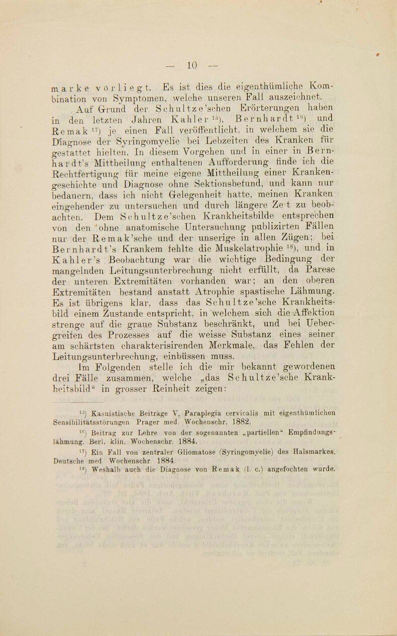 marke vorliegt. Es ist dies die eigenthümliche Kom bination von Symptomen. welche unseren Fall auszeichnet. Auf Grund der Schultze'schen Erörterungen haben in den letzten Jahren Kahler ), Bernhardt ¹) und Remak) je einen Fall veröffentlicht, in welchem sie die Diagnose der Syringomyelie bei Lebzeiten des Kranken für gestattet hielten. In diesem Vorgehen und in einer in Bern hardt's Mittheilung enthaltenen Aufforderung finde ich die Rechtfertigung für meine eigene Mittheilung einer Kranken geschichte und Diagnose ohne Sektionsbetund, und kann nur bedauern, dass ich nicht Gelegenheit hatte, meinen Kranken eingehender zu untersuchen und durch längere Zet zu beob achten. Dem Schultze'schen Krankheitsbilde entsprechen von den ohne anatomische Untersuchung publizirten Fällen nur der Remak'sche und der unserige in allen Zügen; bei Bernhardt's Krankem fehlte die Muskelatrophie 18), und in Kahler's Beobachtung war die wichtige Bedingung der mangelnden Leitungsunterbrechung nicht erfüllt, da Parese der unteren Extremitäten vorhanden war; an den oberen Extremitäten bestand anstatt Atrophie spastische Lähmung. Es ist übrigens klar, dass das Schultze 'sche Krankheits bild einem Zustande entspricht, in welchem sich die Affektion strenge auf die graue Substanz beschränkt, und bei Ueber greifen des Prozesses auf die weisse Substanz eines seiner am schärtsten charakterisirenden Merkmale, das Fehlen der Leitungsunterbrechung, einbüssen muss.