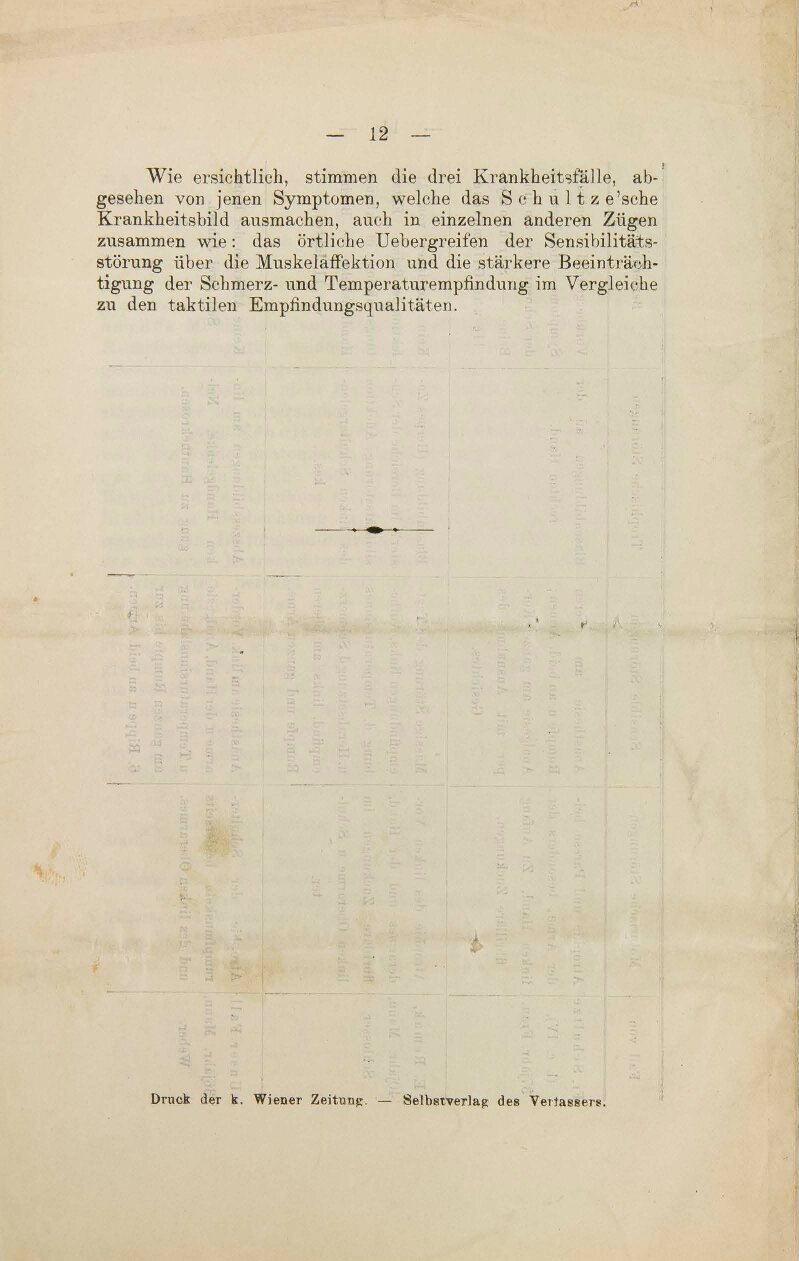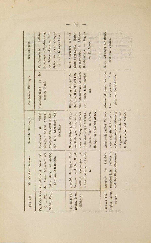 Wie ersichtlich, stimmen die drei Krankheitsfälle, ab gesehen von jenen Symptomen, welche das Schultze sche Krankheitsbild ausmachen, auch in einzelnen anderen Zügen zusammen wie: das örtliche Uebergreifen der Sensibilitäts störung über die Muskelaffektion und die stärkere Beeinträch tigung der Schmerz- und Temperaturempfindung im Vergleiche zu den taktilen Empfindungsqualitäten.