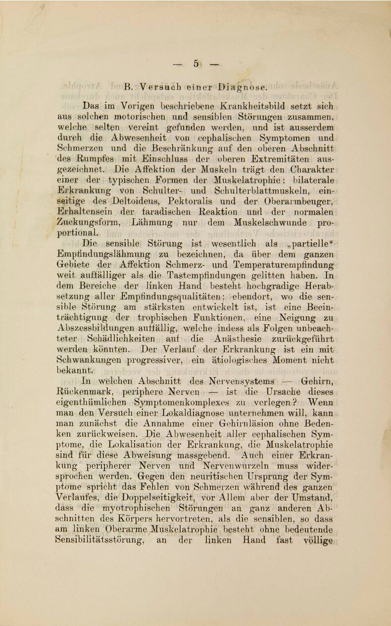 In welchen Abschnitt des Nervensystems Gehirn, Rückenmark, periphere Nerven ist die Ursache dieses eigenthümlichen Symptomenkomplexes zu verlegen? Wenn man den Versuch einer Lokaldiagnose unternehmen will, kann man zunächst die Annahme einer Gehirnläsion ohne Beden ken zurückweisen. Die Abwesenheit aller cephalischen Sym ptome, die Lokalisation der Erkrankung, die Muskelatrophie sind für diese Abweisung massgebend. Auch einer Erkran kung peripherer Nerven und Nervenwurzeln muss wider sprochen werden. Gegen den neuritischen Ursprung der Sym ptome spricht das Fehlen von Schmerzen während des ganzen Verlanfes, die Doppelseitigkeit, vor Allem aber der Umstand, dass die myotrophischen Störungen an ganz anderen Ab schnitten des Körpers hervortreten, als die sensiblen, so dass am linken Oberarme Muskelatrophie besteht ohne bedeutende Sensibilitätsstörung, der linken Hand fast völlige